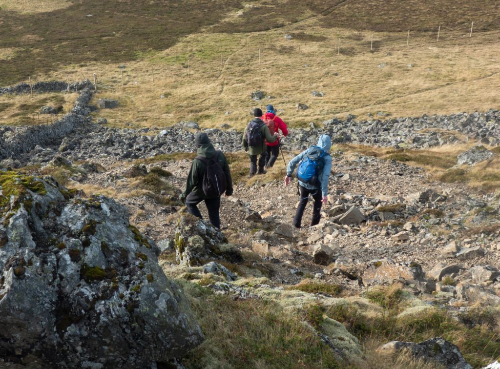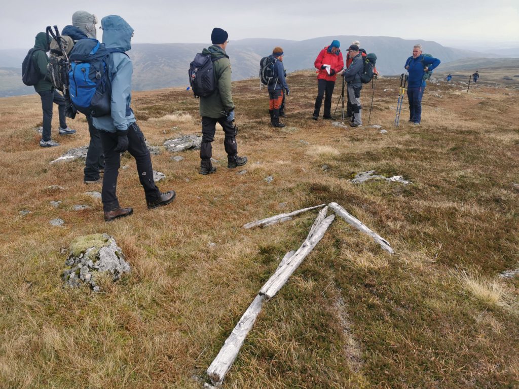 The old fence line turns south east and as we made our way along bumped into the other half of our club. Realising they were travelling slower and us and would take a while to get to the top and down, we decided rather than the direct descent we’d push on a bit further – we could see a rocky outcrop a couple miles yonder – Carn Chois