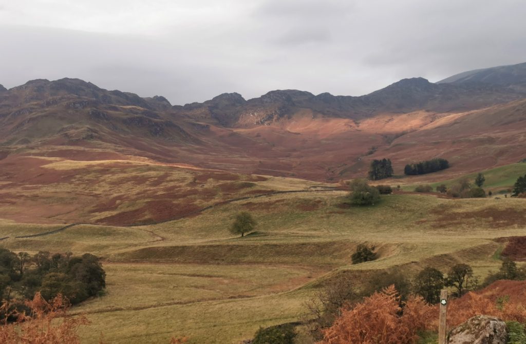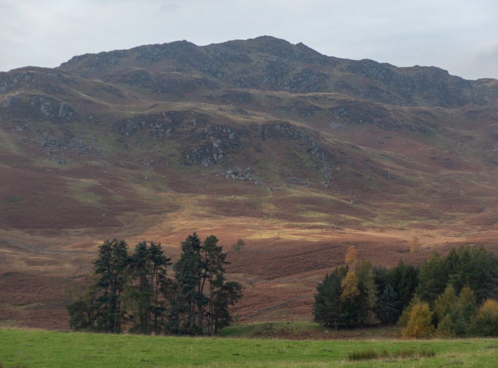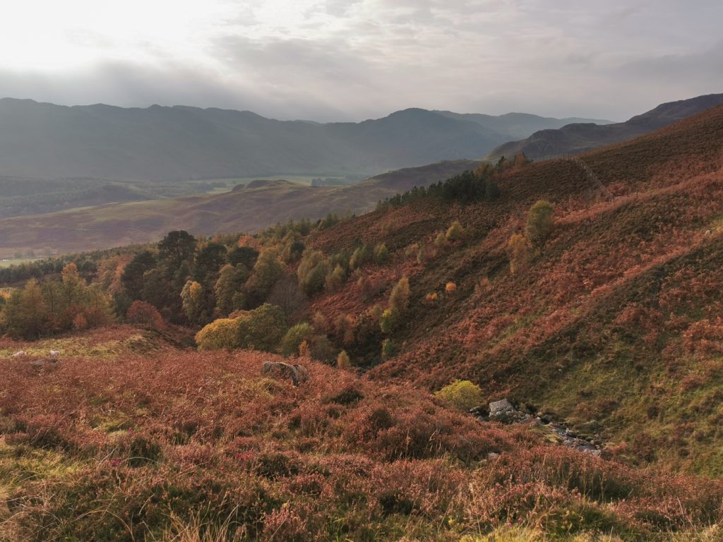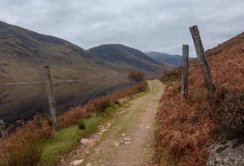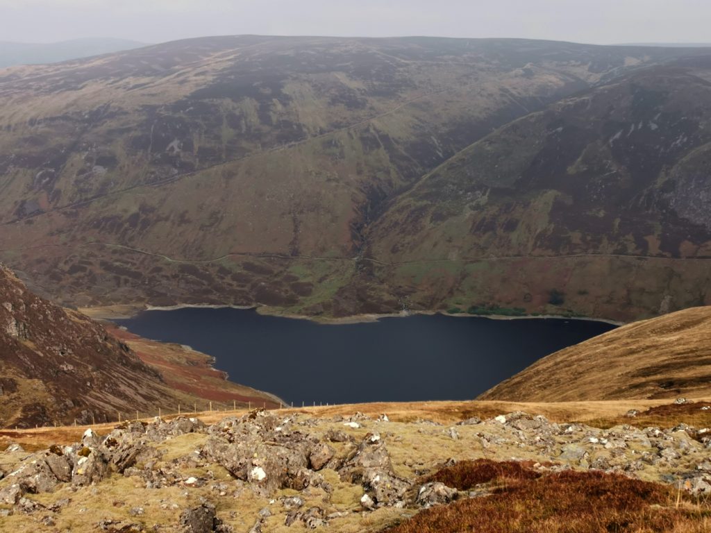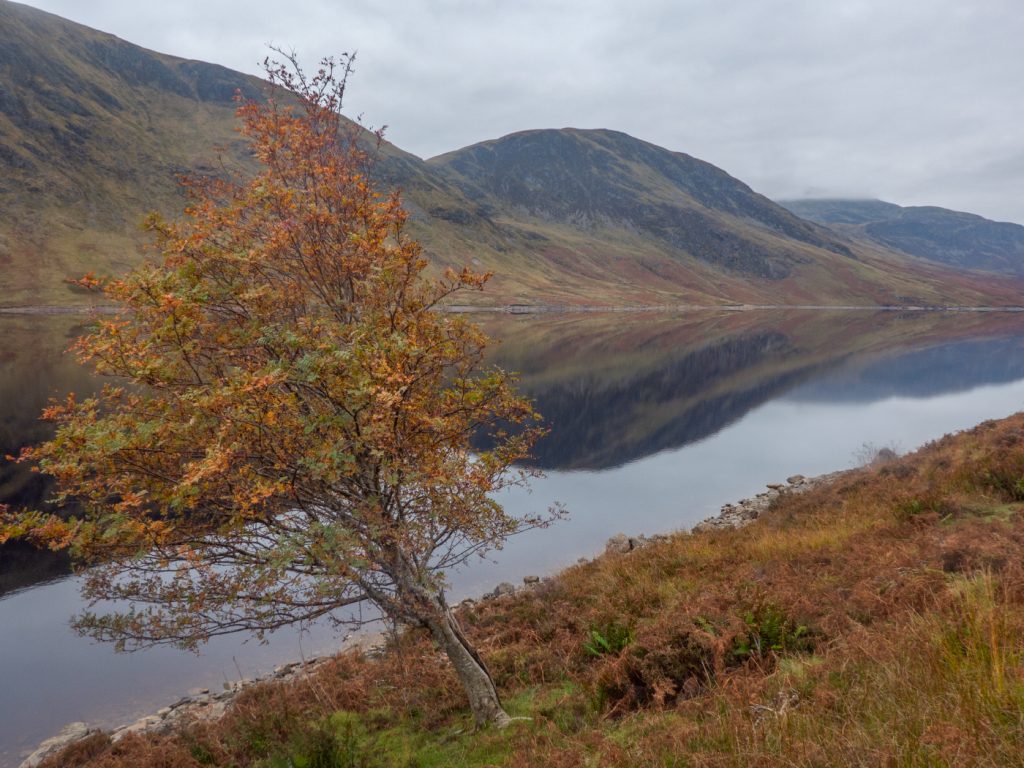 The loch was a shiny mirror due to being sheltered in the wind shadow of the hill, and there were a few lone trees and small stream waterfalls tumbling from above. Towards the end of the loch there’s a magnificent array of glacial hummocks, and standing on one of these was a good viewpoint back along the loch.