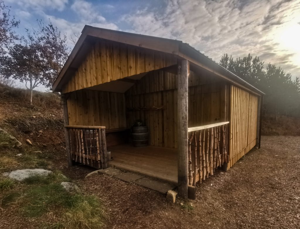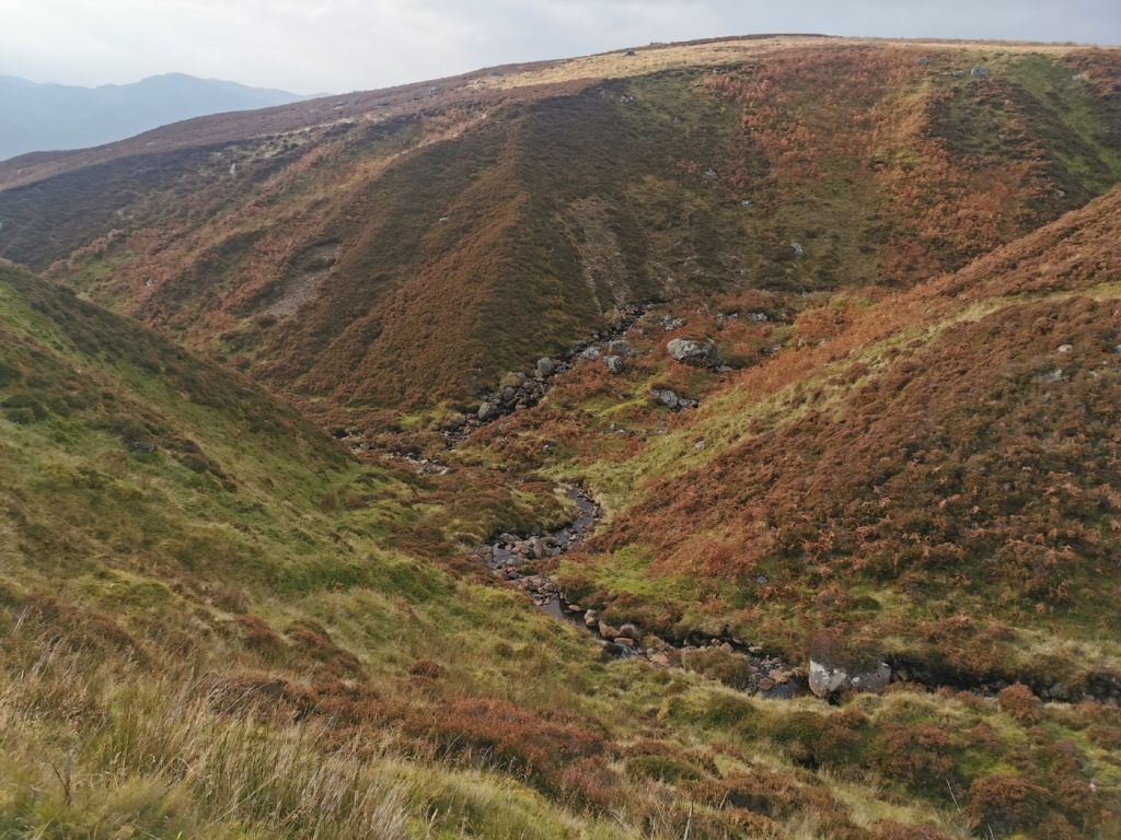 I noticed the map had a copse of woods with waterfall marked on it, and I jumped a fence to leave the track and explore. There was a wee hut there, probably for shooters. The burn goes into a deep gorge – the bottom of the waterfall wasn’t approachable safely – a long rope or a scramble up the burn from way downstream would be needed. There are no photos of it online anywhere, so presumably difficult to reach from below too.