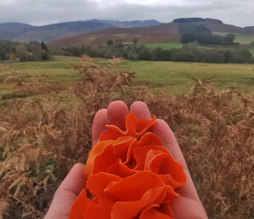 Reaching the road to Glen Lednock we managed to make contact with the other party, saving us a long trudge on tarmac, they’d drive along to us. I had a poke around for mushrooms finding this fine specimen of orange peel mushroom.
