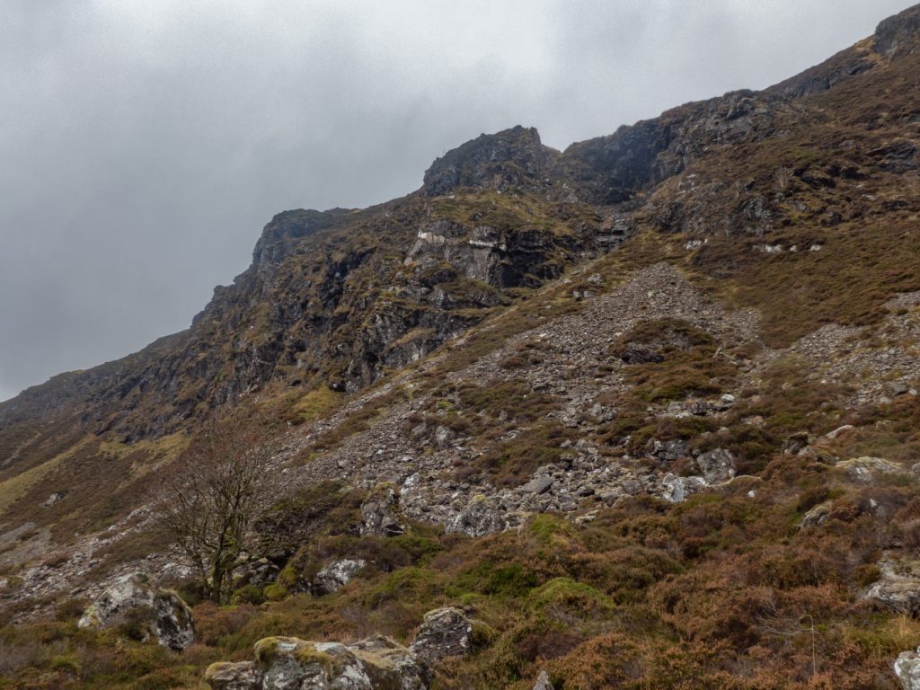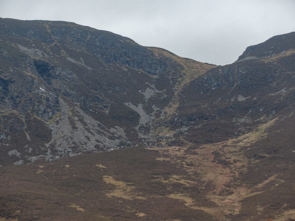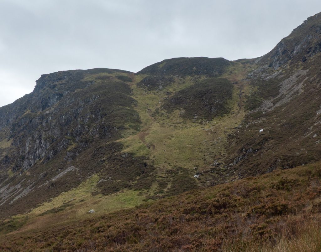 A scrape of a path heads up the left edge of the lighter stripe to a gap Bealach na Gaoith, above