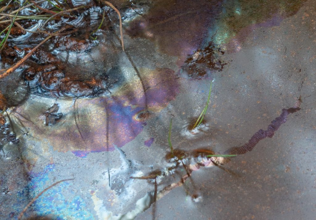 Lots of boggy ground with rainbow coloured bacterial film