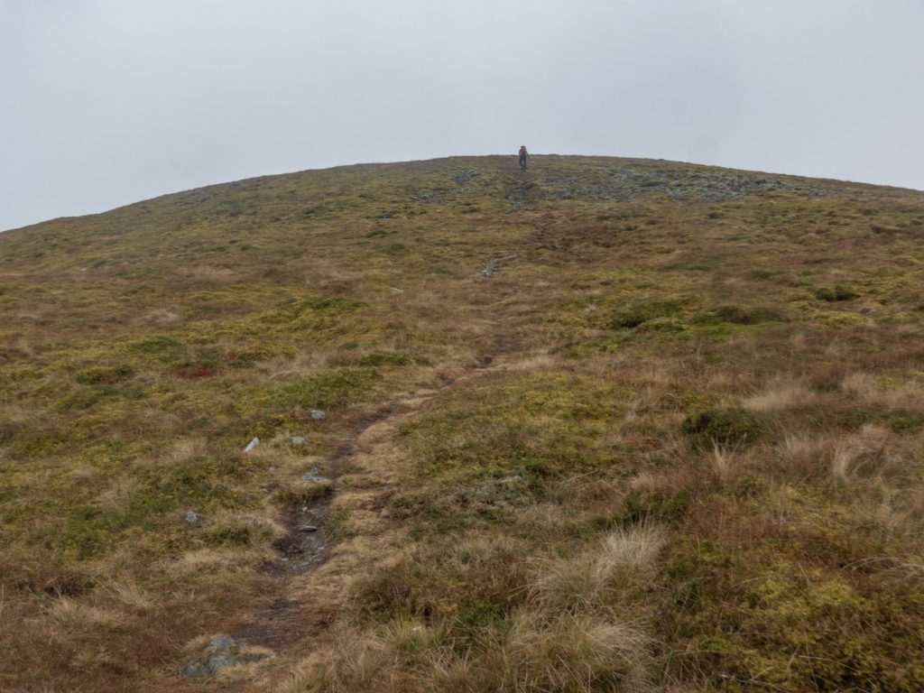 Once out of the Bealach, the gently rolling plateau was reached and sure enough the wind rose and the visibility dropped as we made for the top.