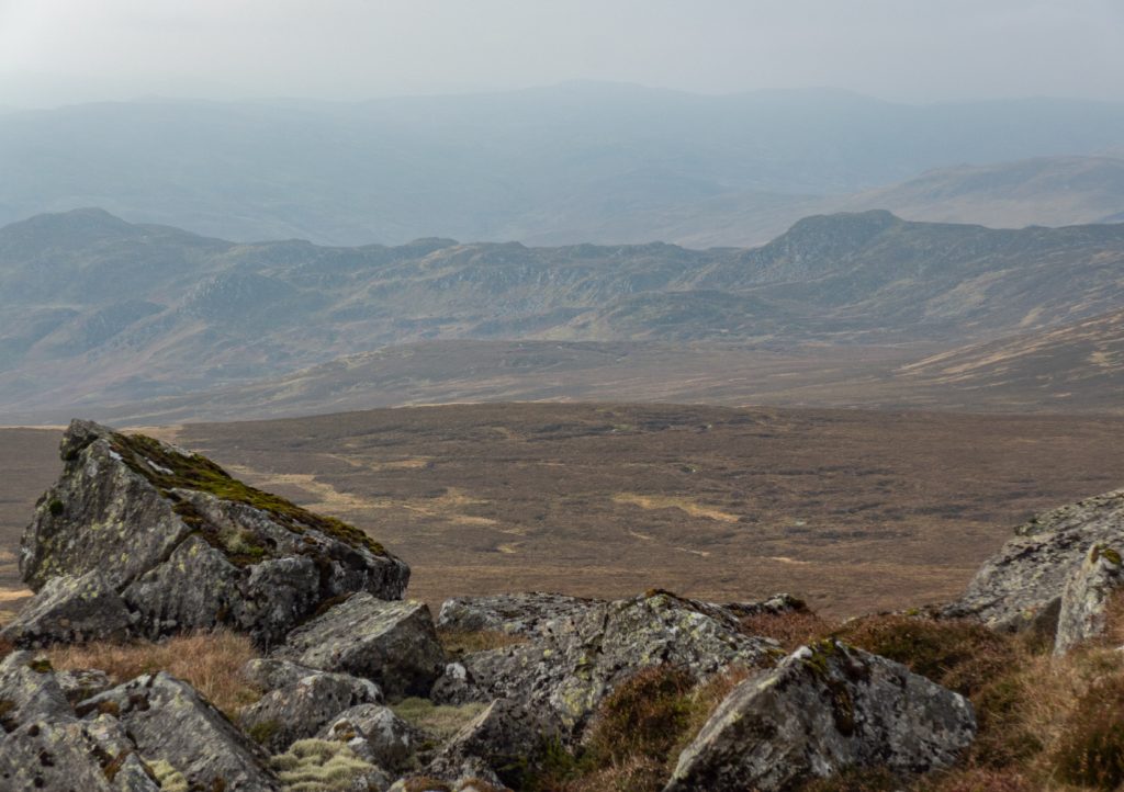 Meall Reamhar and Dun Mor ridge distant through the haze