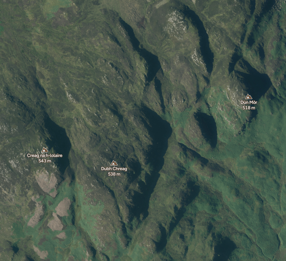 From the top of Carn Chois I could see an interesting ridge of rocky terrain west – starting at Coire Riabhach, then down through Meall Reamhar, Dun Mor, Dubh Creag, Creag na h-iolaire and some other lumps and knolls. Looking on the 1:25k map, it’s a complex rummage of terrain – but being from 400m – 600m and lying between two regular routes to the munro heights I doubt they are “categorised” and get much visitation; but there’s action to be had there no doubt though.