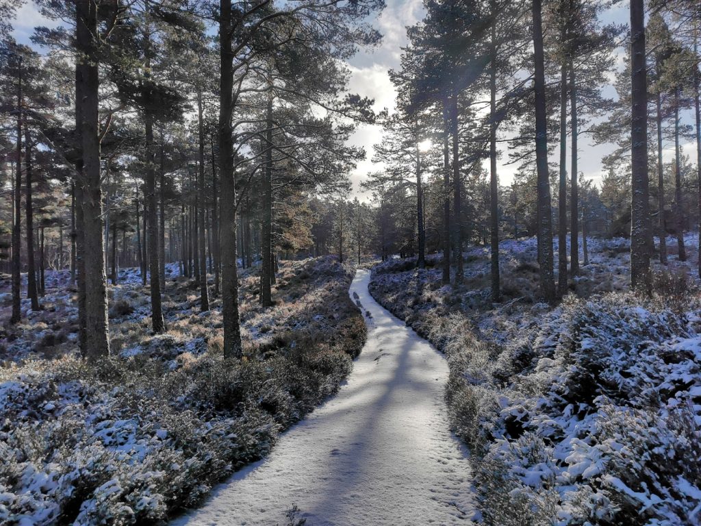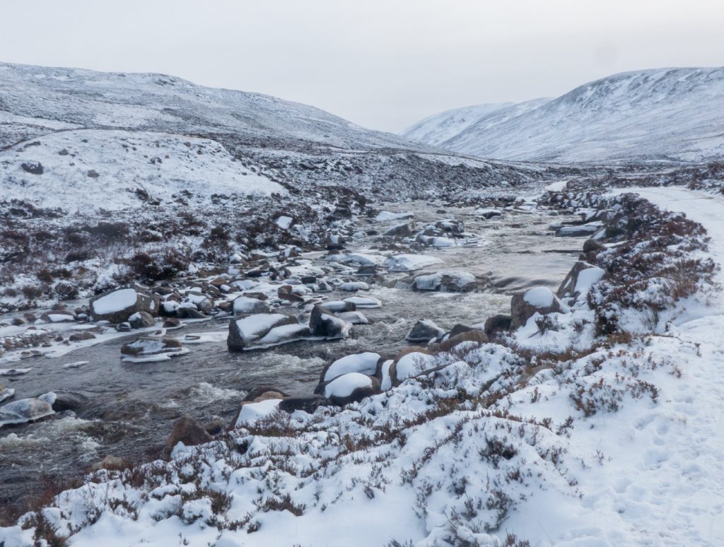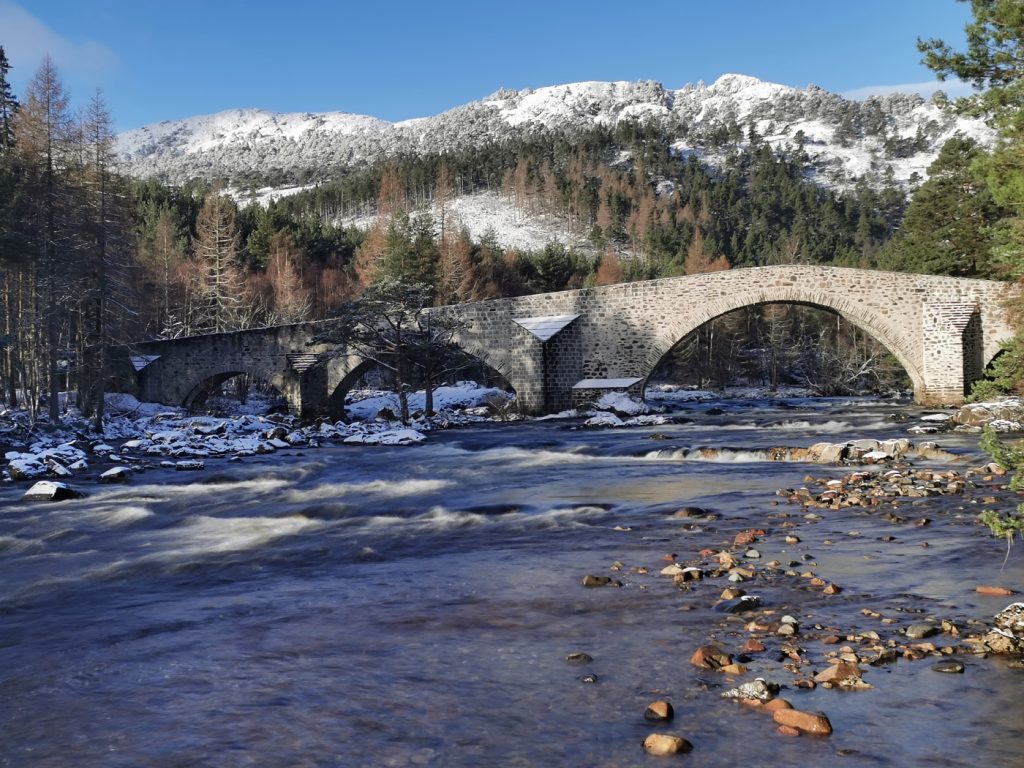 I took a break at the bridge, crampons off, delayering, now a march to Braemar. The track had a dusting of snow but easy going.