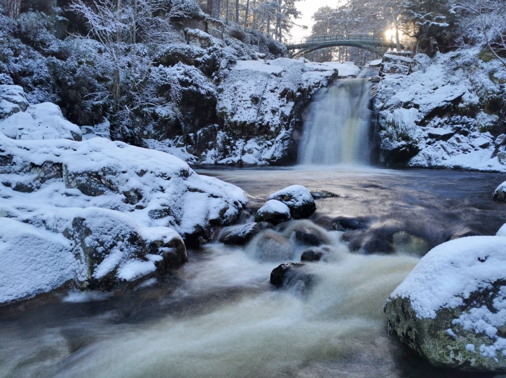Reaching the Glas Allt falls I realised that the internal fence nearby had gone, as has the outer fence. There were deer prints around so whether Balmoral have given up on conserving the ancient pine woods against overbrowsing, or there is an intent to reduce deer numbers (something Balmoral have ignored in times past) is unclear. I’ve never seen any capercaillie here but it’s possible that fencing removal is related to their presence.