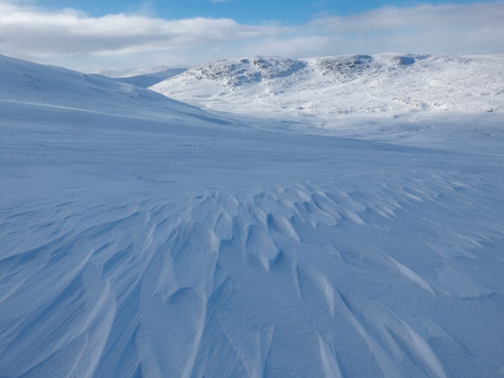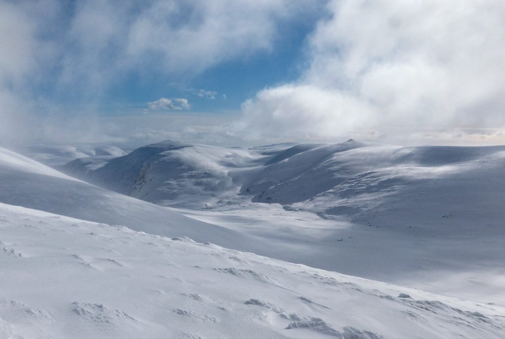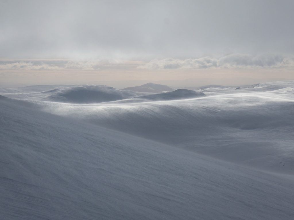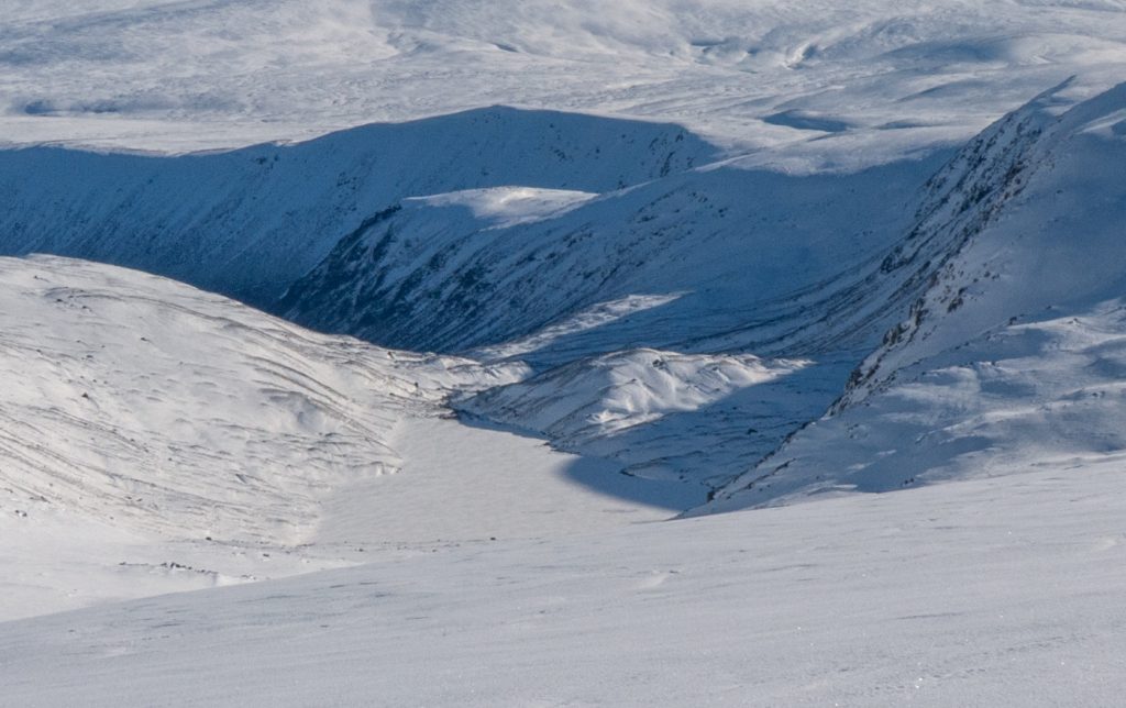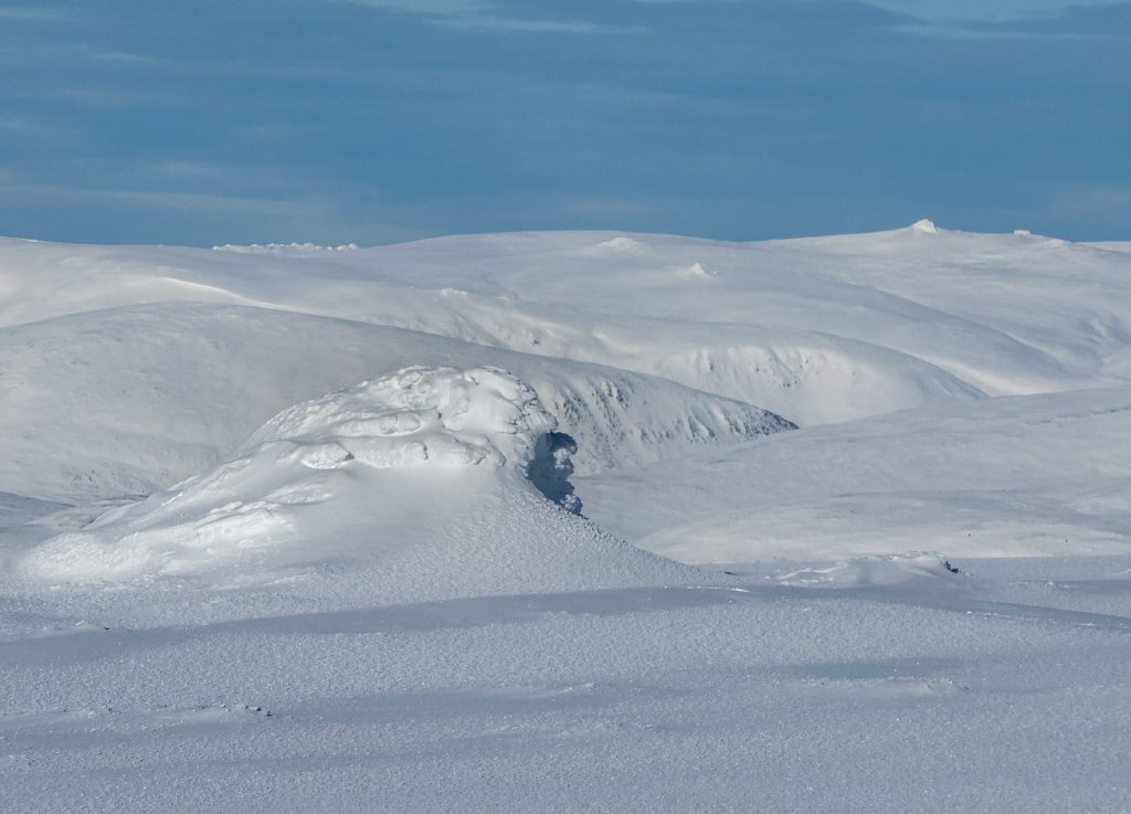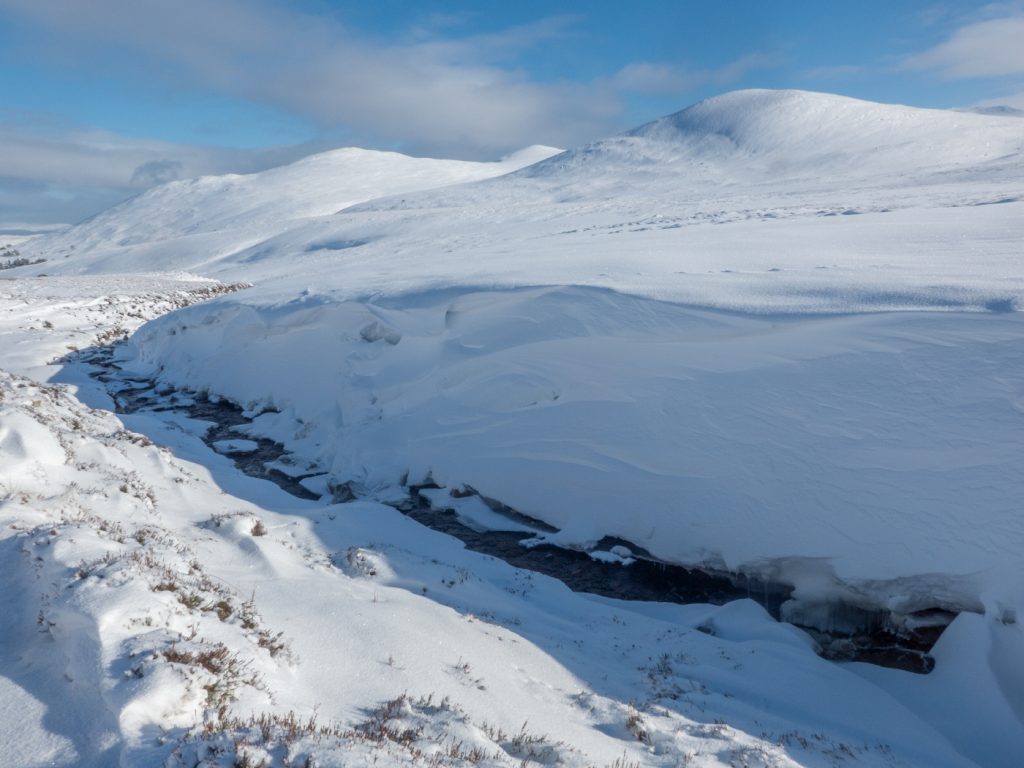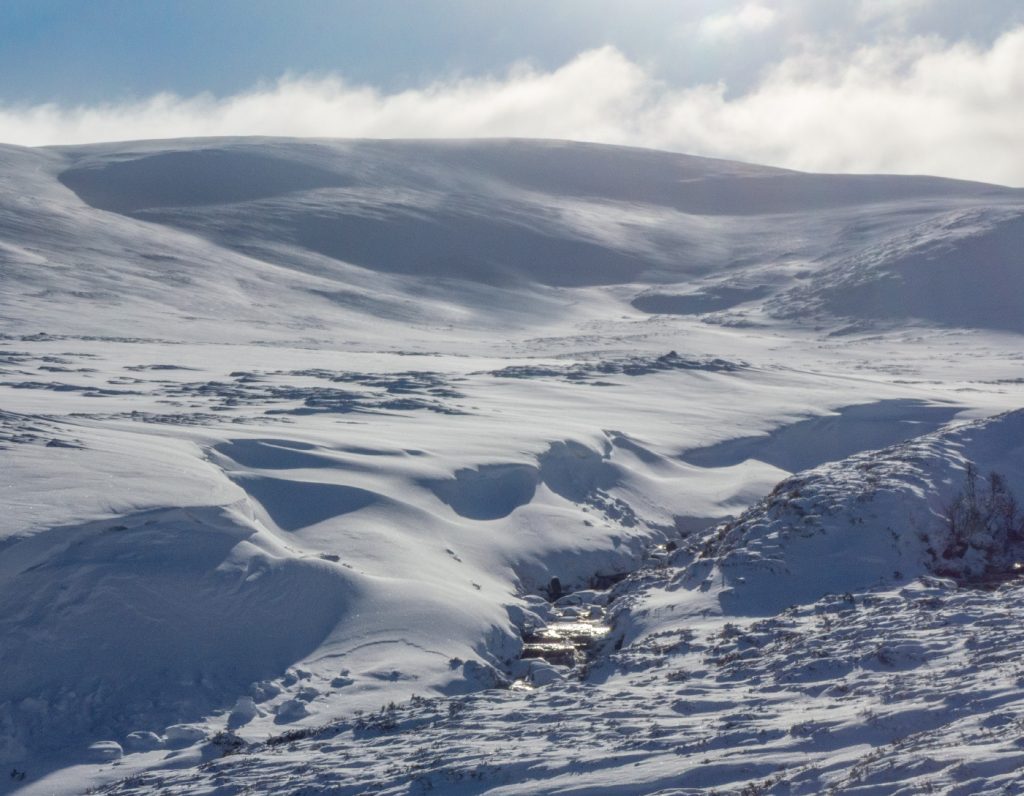 I could spot some huge snow waves and drifts along the Allt an Da Chraobh Bheath, and marked them as a backup snowhole location, but decided to continue onwards to my usual site at Coire Boidheach. Ascending towards Carn a Choire Bhoidheach there were unusually some steep snow banks there too. As I got higher I entered cloud and soon I was back in the “white room” heading east on the plateau