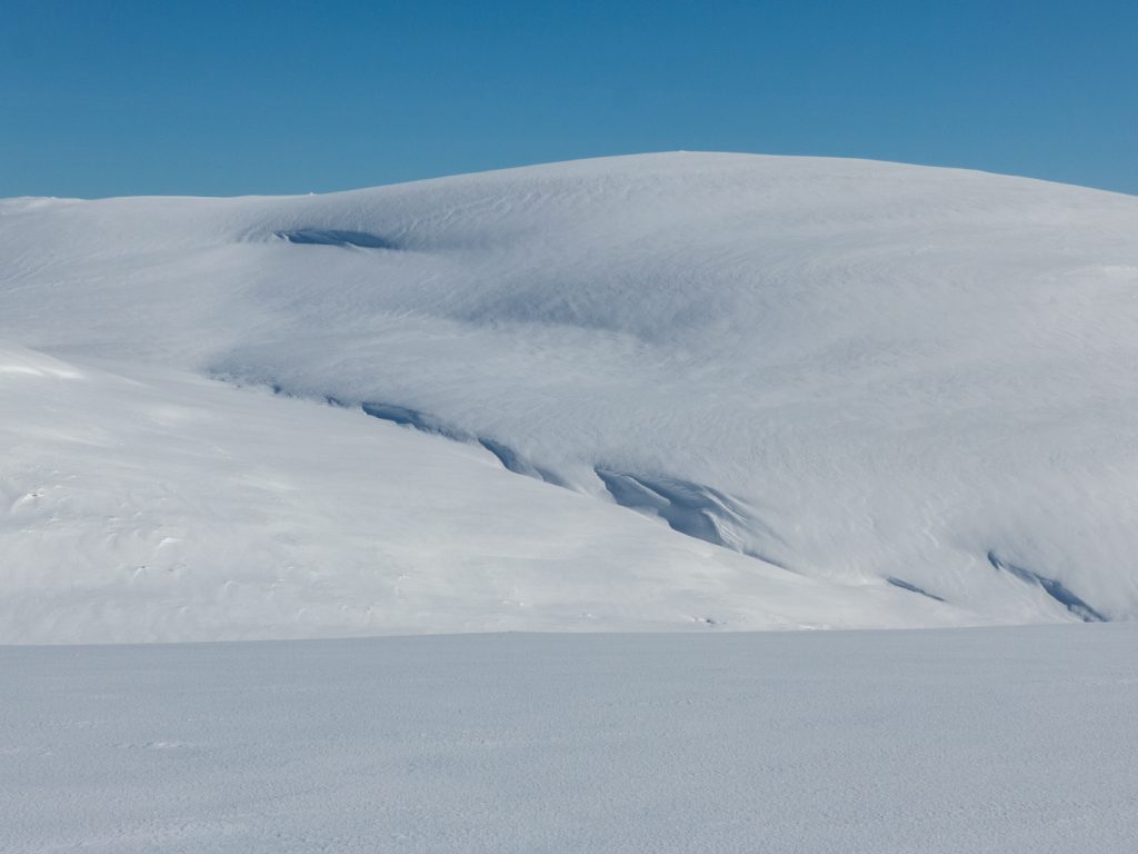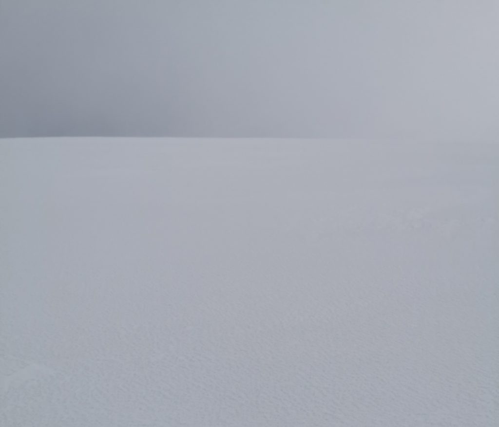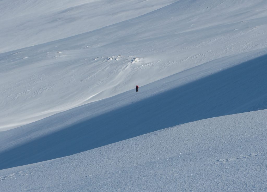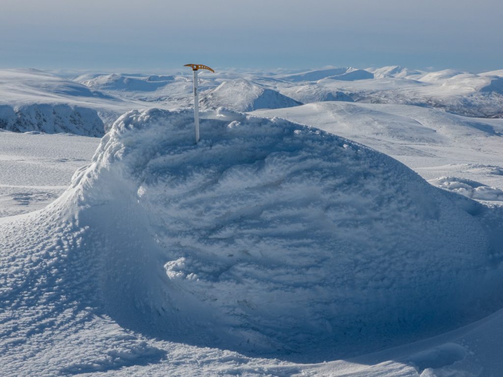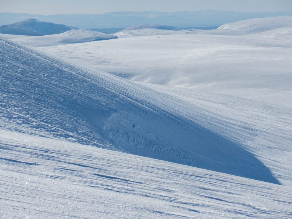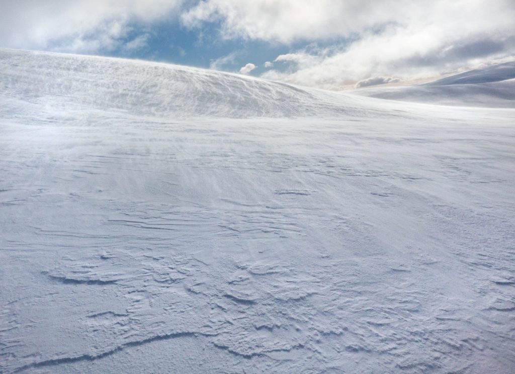 I could spot some huge snow waves and drifts along the Allt an Da Chraobh Bheath, and marked them as a backup snowhole location, but decided to continue onwards to my usual site at Coire Boidheach. Ascending towards Carn a Choire Bhoidheach there were unusually some steep snow banks there too. As I got higher I entered cloud and soon I was back in the “white room” heading east on the plateau