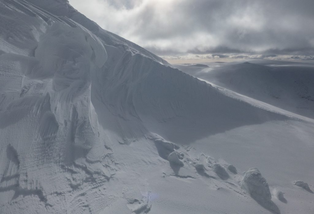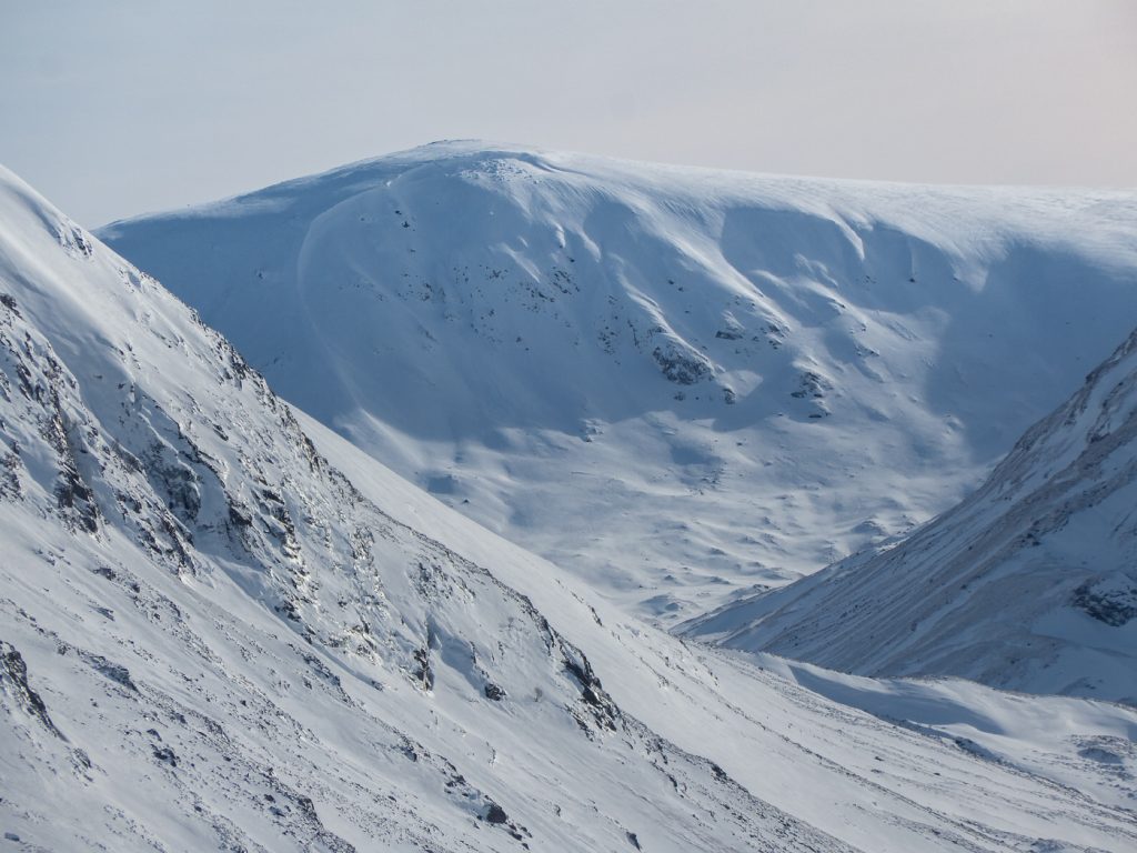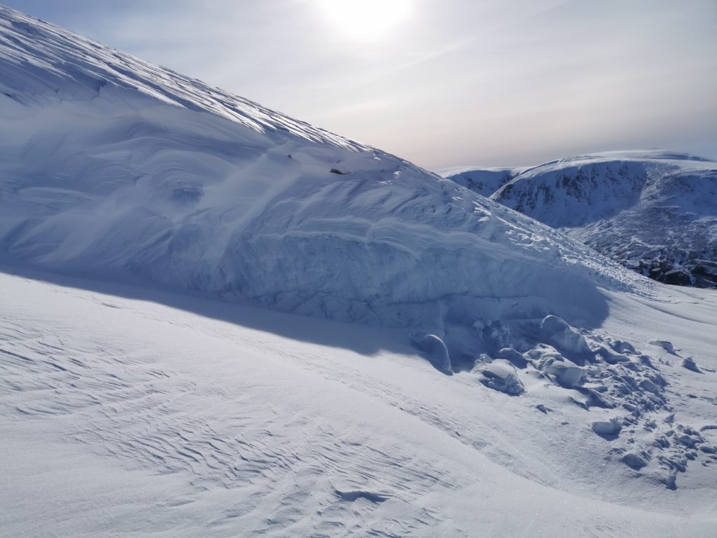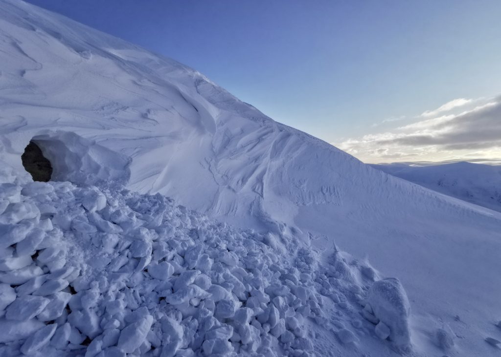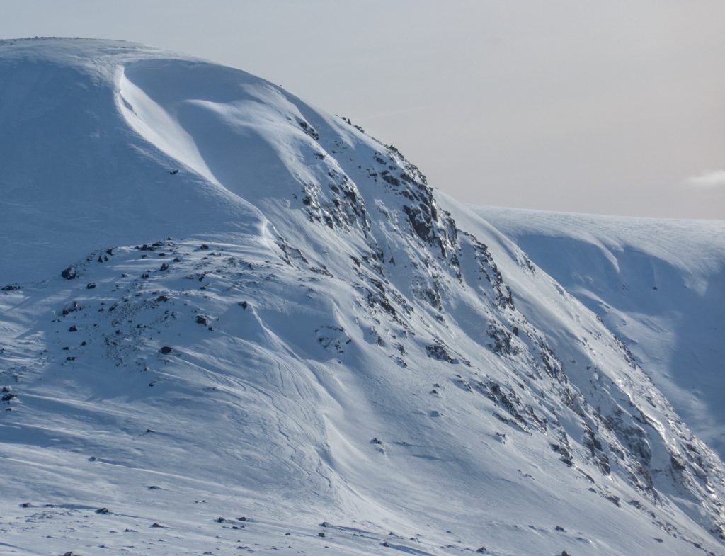 The snowpack varied between soft fresh snow and scoured hard old neve, it was tough going either sinking or skittering, but so far I managed without crampons on. Approaching Carn an t-Sagairt Mor, the visibility dropped briefly as some cloud passed, annoyingly obscuring a large avalanche evident on the steep north side. The run out was substantial and some of the debris blocks were car-sized – yikes. I took a shot to send to the avalanche service.