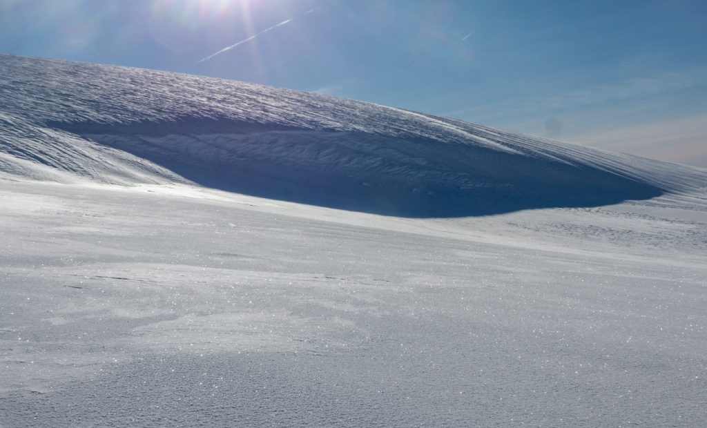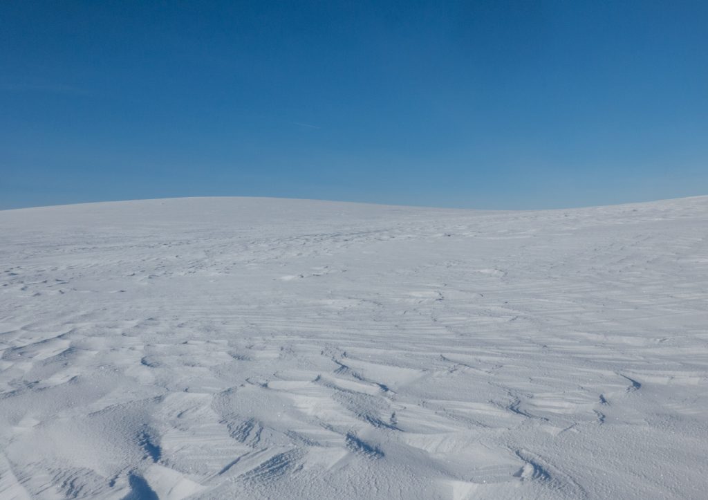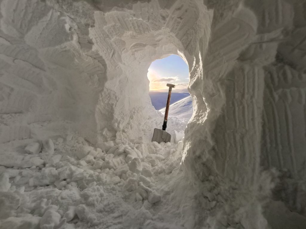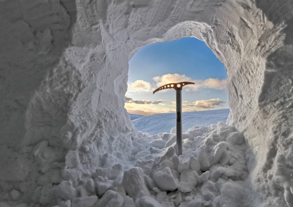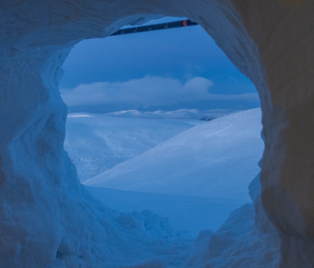Entering the coire, it was “flattened out” with no obvious snow wall to dig into, the wind direction had blown snow into it filling it up. Uh-oh. I could dig down but it would be hard to excavate fighting gravity. Would I have to bail to a bothy, or return back towards the the burn I’d crossed earlier? Fortunately in a momentary break in visibility, I saw some wrinkles in the snow towards Eagles Rock about half a mile away (usually be a gently curving slope) and decided to head over to investigate.