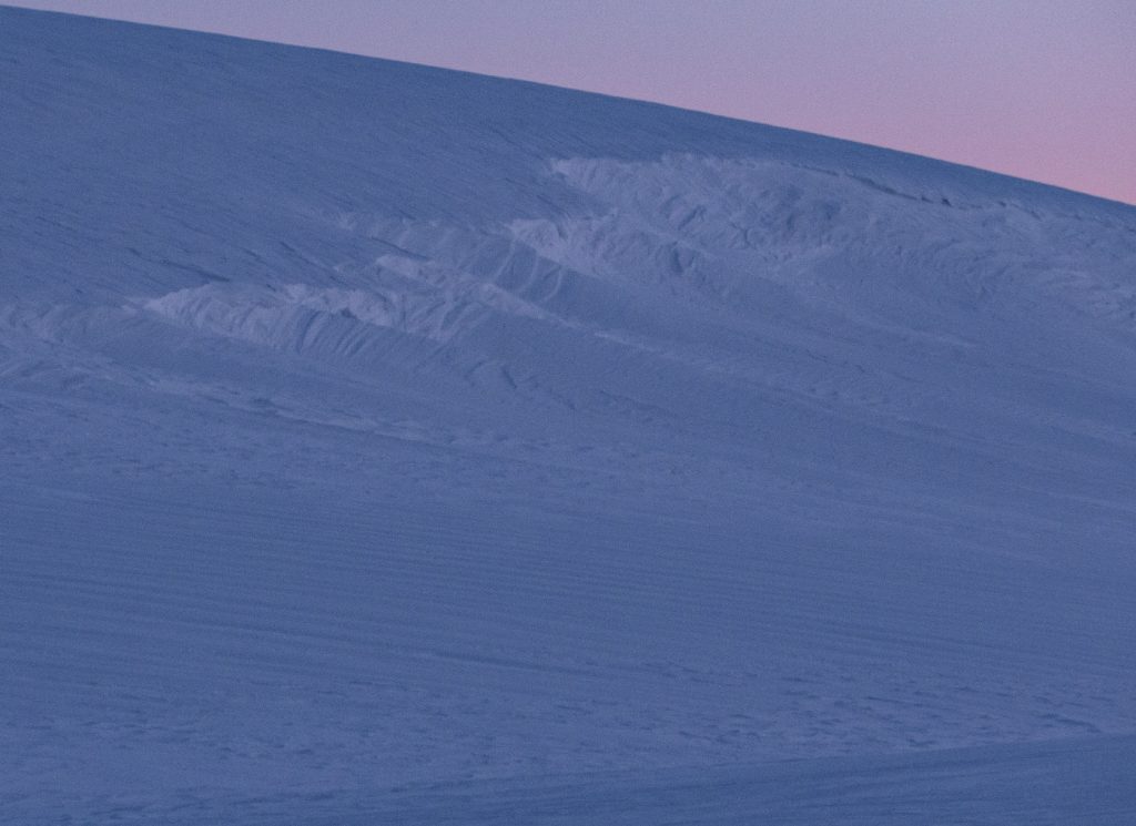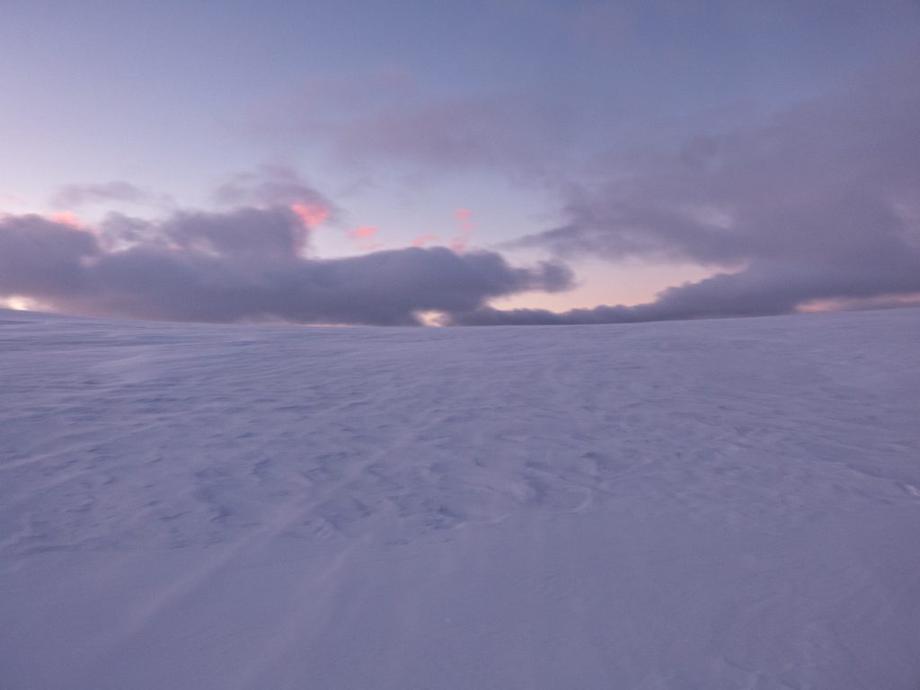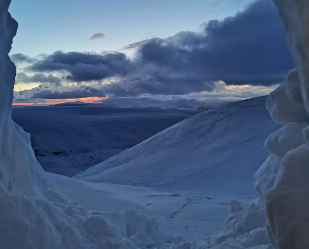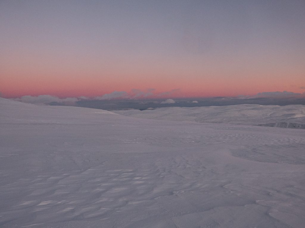 Sun up and I though I’d maybe take a walk to Lochnagar top, but while on scoured neve it was quick going, there was plenty wind blown soft areas that weren’t. I headed to the top of Coire an Daimh Mhoile to see if any impressive snow sculpture (nope) then back to Coire Boidheach to have a look in better light (correct to not have attempted a dig there) then time for breakfast back at the hole, while the dawn tones washed over the plateau.