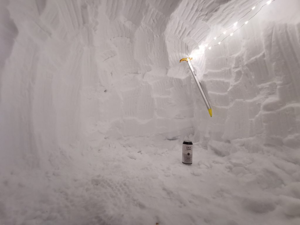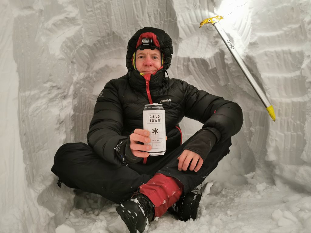 I made it back to the hole as darkness set in, and unpacked my cooking kit and a singular appropriate beer treat – an Edinburgh brewery called Cold Town – and set up my recording thermometer outside. I planned a little experiment – one inside, one out to see the difference. My goretex jacket went up as a curtain over a pole across the door. (went down to -9c outside / -6c inside). Chem heaters into the boots to stop them freezing.