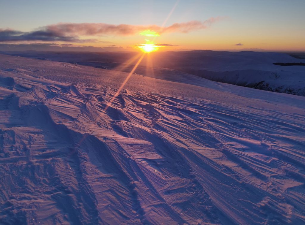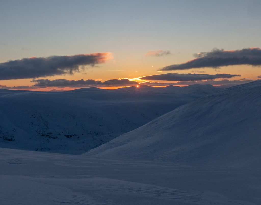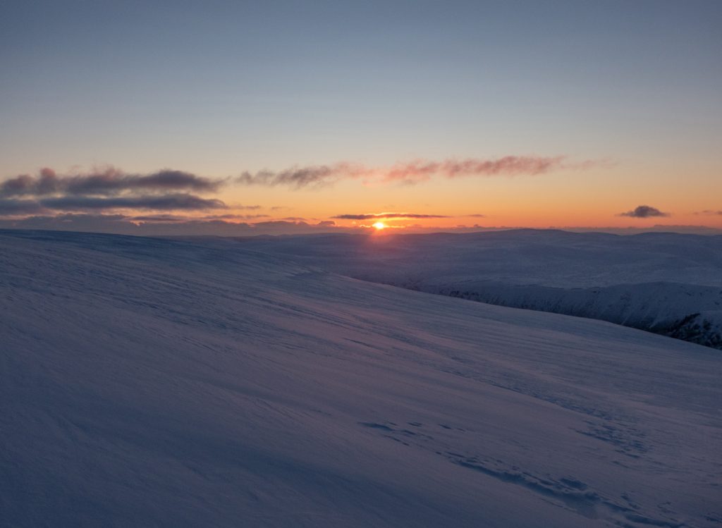 I started unpacking and couldn’t find my “beacon” light for outside the hole for a night-time stroll, so decided to head out at sunset – get the clothes dried out from the digging a bit with a brisk walk. At least this time I hadn’t soaked my gloves – using a pair of cheapo “freezer work gloves” had worked perfectly. On reflection, the location here was visible from the tourist path between Cairn Bannoch and Broad Cairn – maybe best I didn’t have the beacon light in case of any “false alarms” a blinking light might cause.
