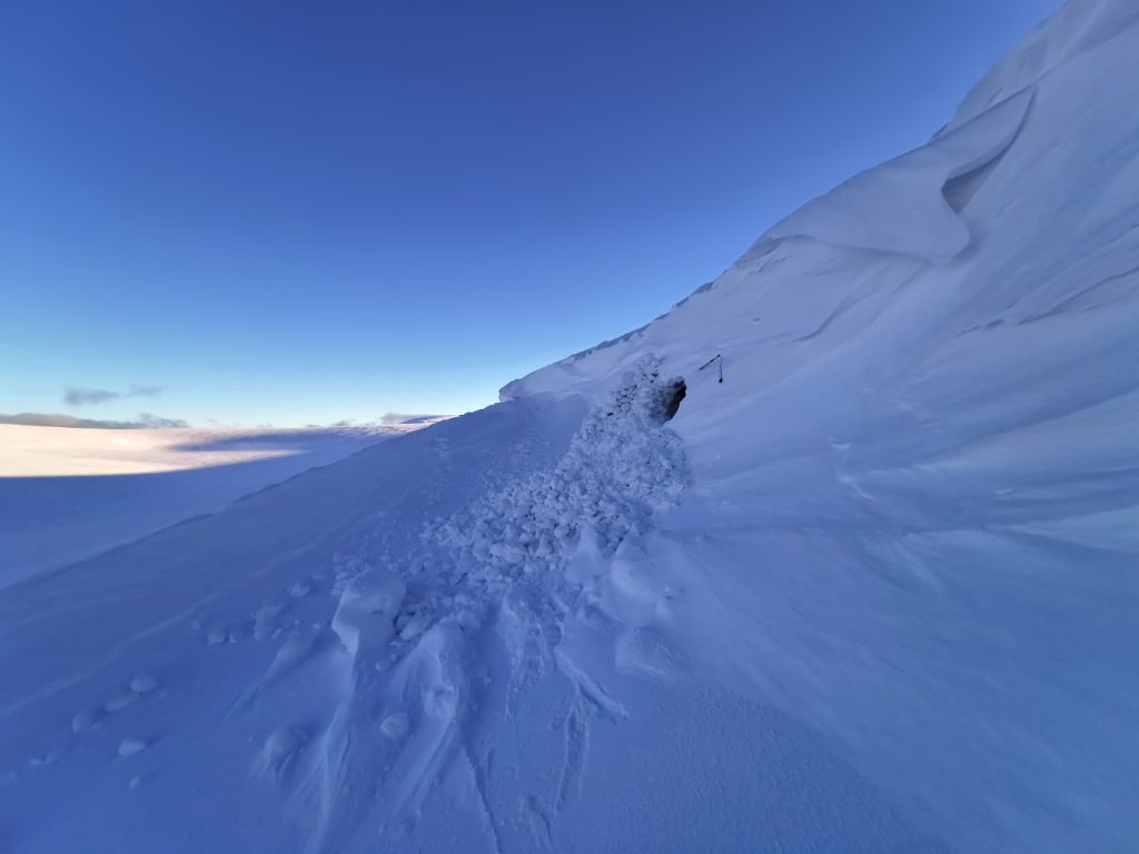 I headed a bit towards the big avalanche to have a nosey but not too close, looking up there were still huge cornices waiting to come down. The crown wall of the avalanche was a few metres – hence the large blocks.