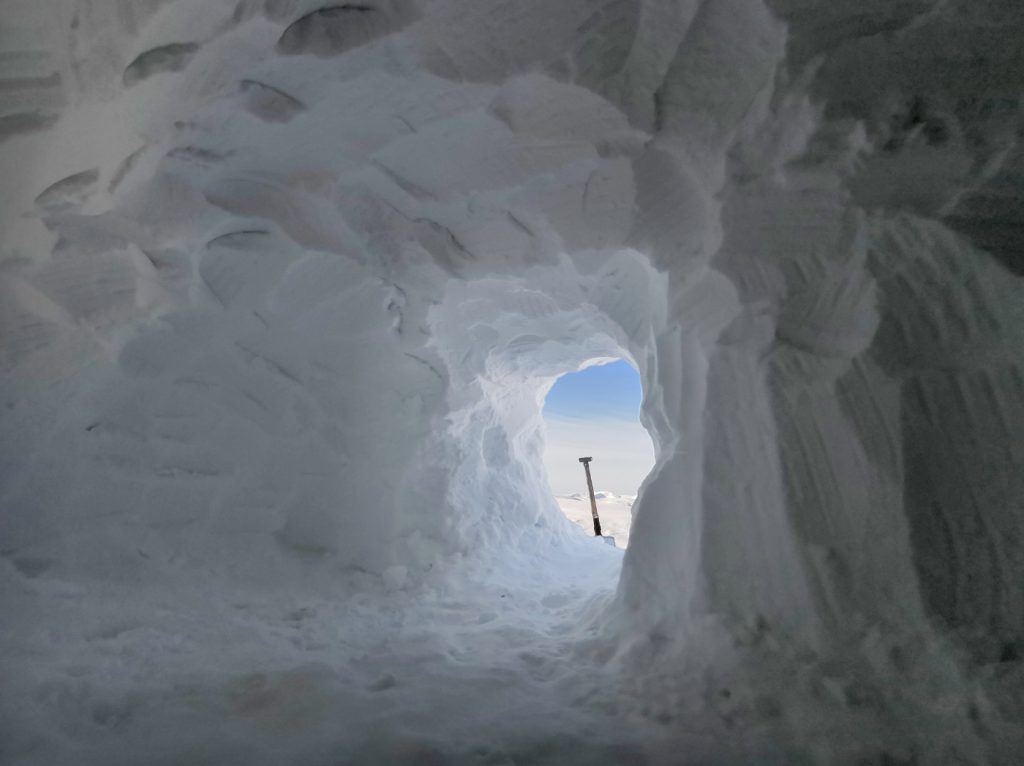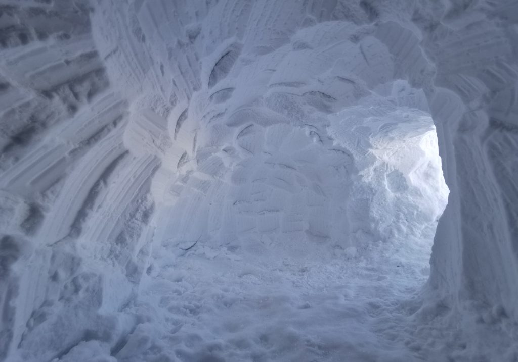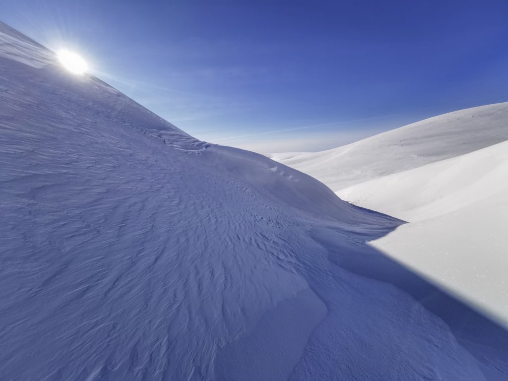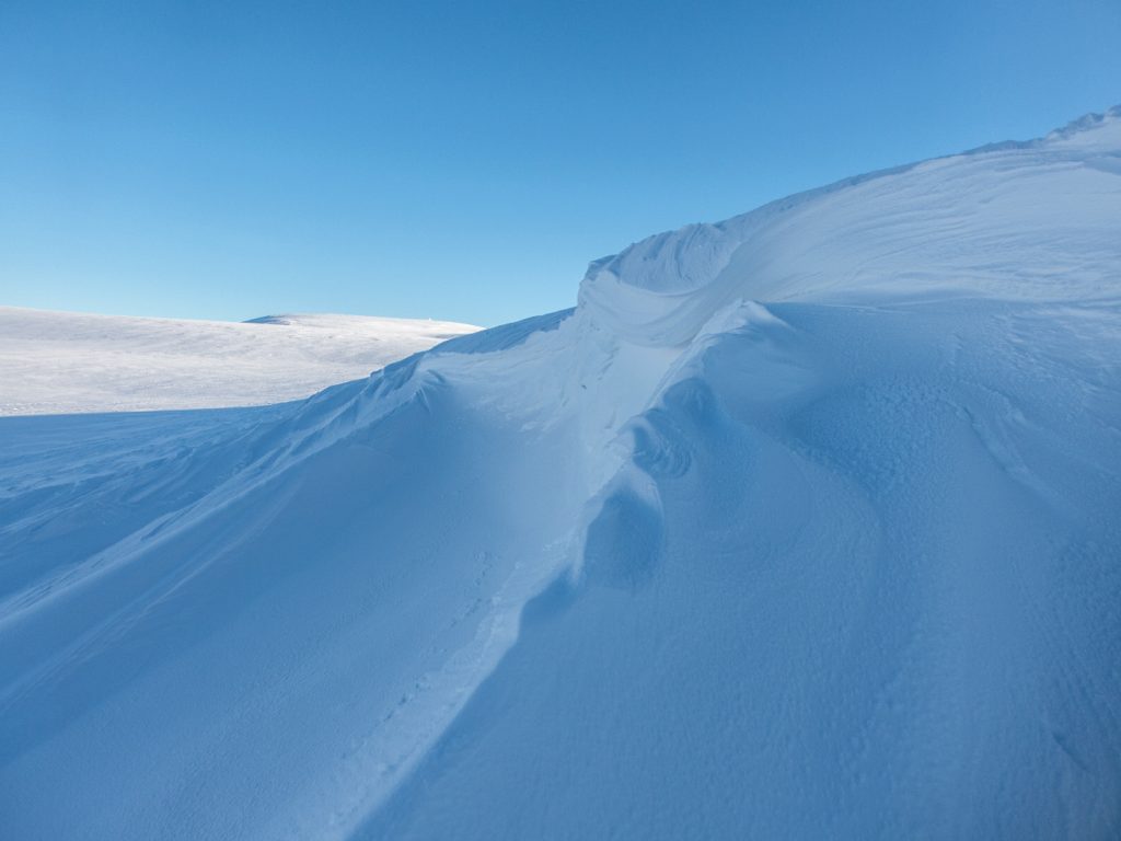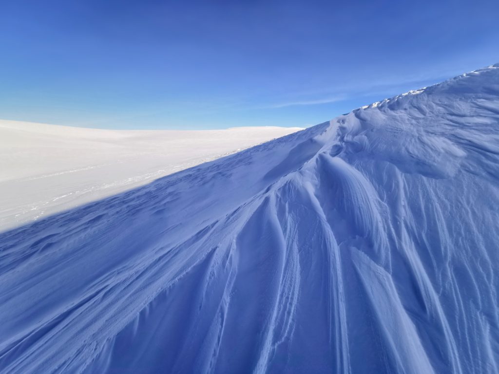 2 hours later I’d hacked out enough space to lie down but also get all my kit inside – the forecast was for a strong wind overnight switching to the north, with static temperatures of -12c and windchill below -20c. I decided to build a windbreak wall to protect the entrance from excessive drafts and spindrift. The wind was aready picking up, and the eddies and air currents formed around the ridge had tendrils of spindrift winding sinuously and lit by the late afternoon sun, quite mesmeric.