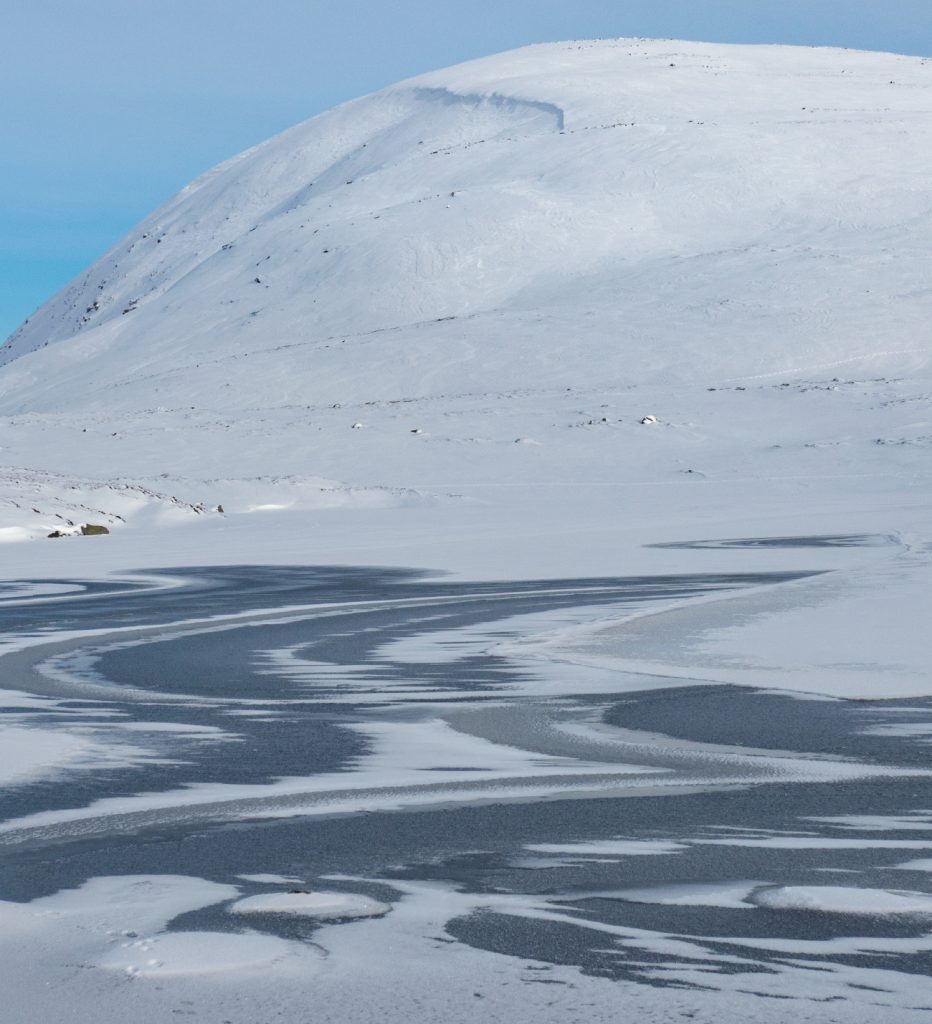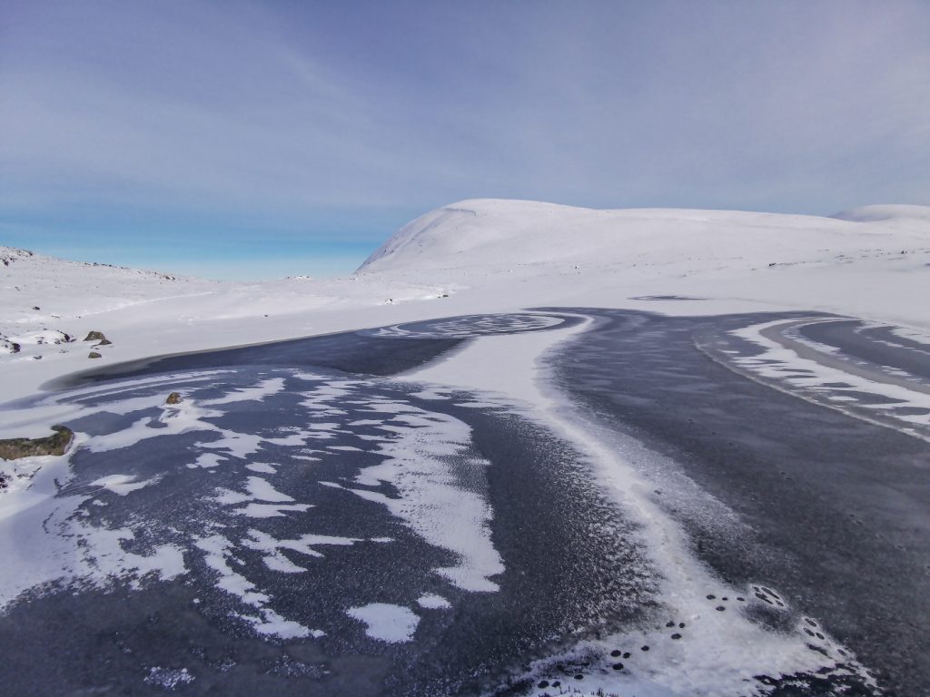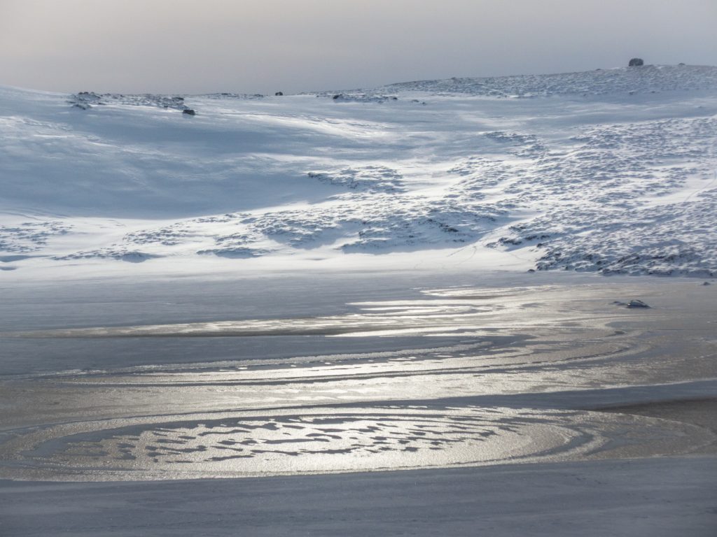 I’d thought to descend to the bothy as I was beginning to tire, but the sight of the shapes on the loch inspired me to head to one last target at Loch Phadruig. I climbed a bit from the tourist path and headed to it sometimes on steeper ground but the soft snow here meant while it was harder work it was also more walkable without foot-concentration. Reaching the loch it had some interesting whirls and patterns and I was glad to have made the effort.