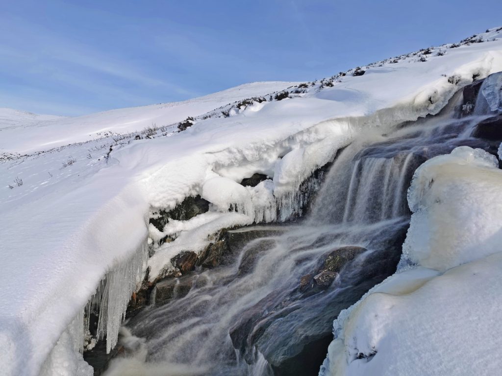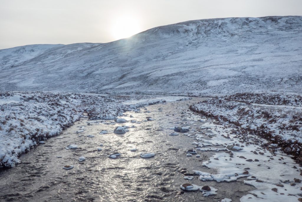 Aberdeen had suffered the longest recorded period without sun ever at the end of January into February. With the break in the gloom in sight with a forecast for perfect blue skies on a Friday and Saturday, I booked a day off work to head out and spend overnight high on the mountains. 7am saw me on the bus to Keiloch near Braemar, and disembarking with a heavily-loaded (15kg) rucksack, but a beautiful crisp morning.