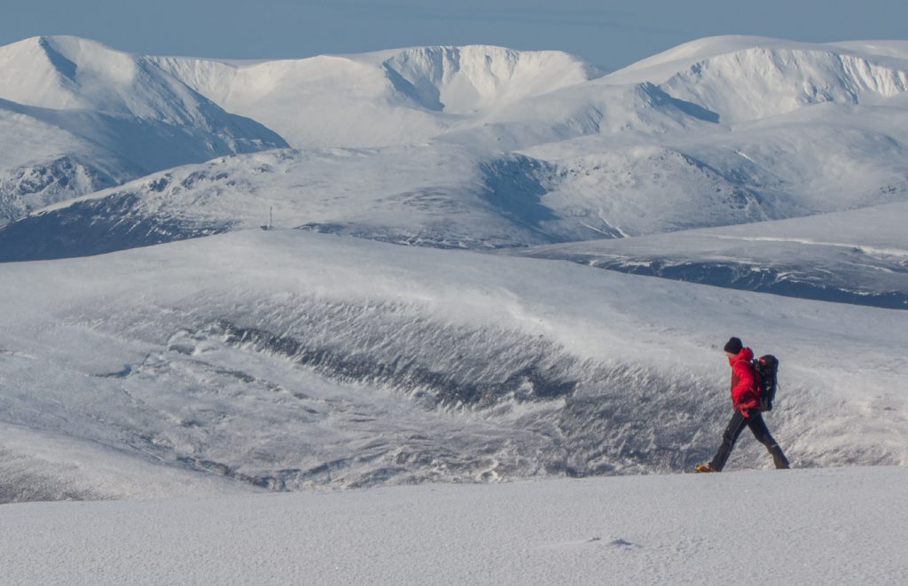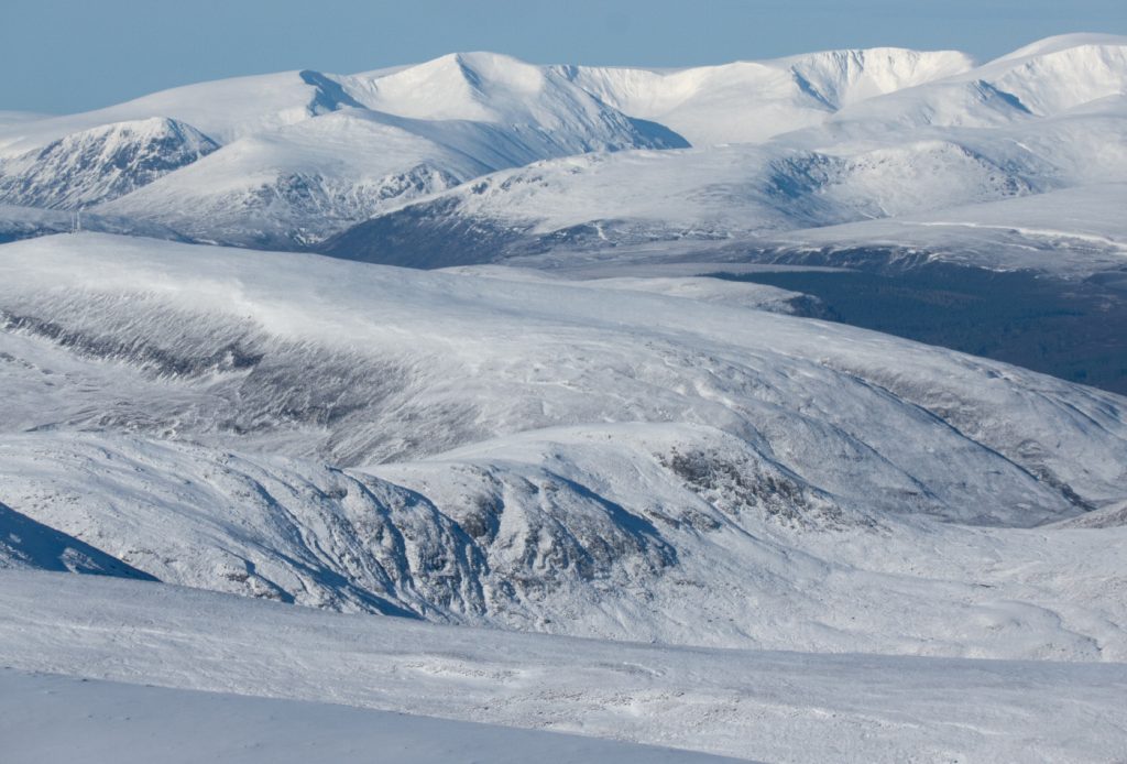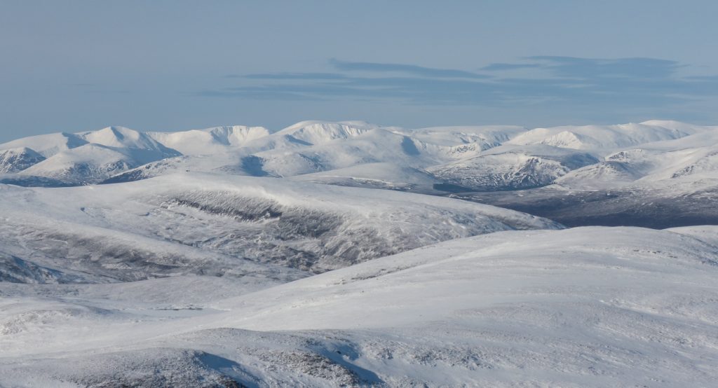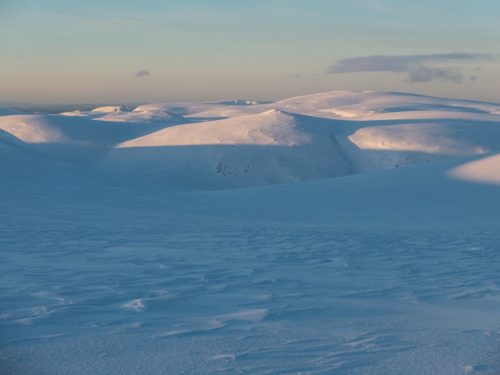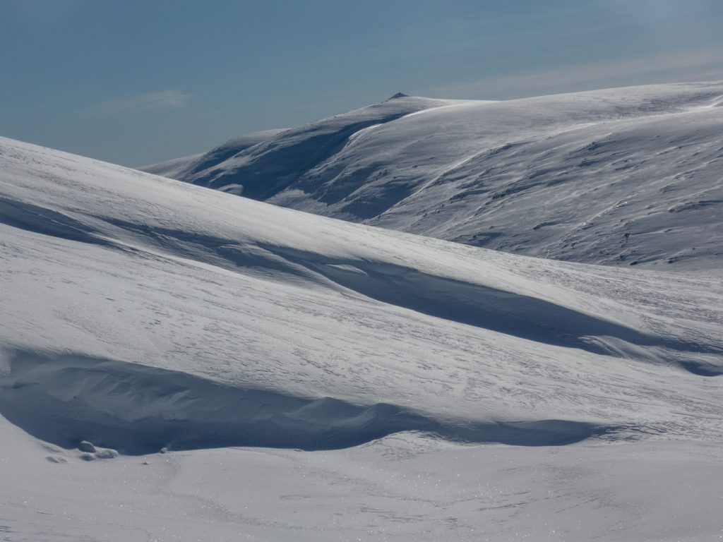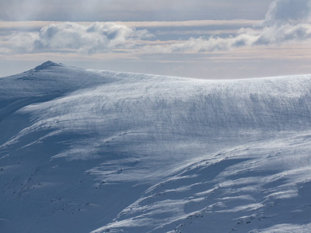 Contouring around Carn an t-Sagairt Beag and leaving the col, the wind picked up and fronds of spindrift could be seen crawling over Cairn Bannoch, I could spot a tiny dot of somebody else on top there also enjoying a fabulous day to be out.