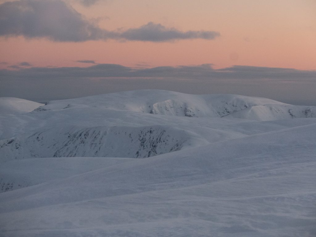 I headed over the hill to the other side where sunrise would be, scoping for any interesting wind features in Coire an Lochan Bhuidhe, but the intense windchill and spindrift soon had me returning to the hole, with the alpenglow fading quickly