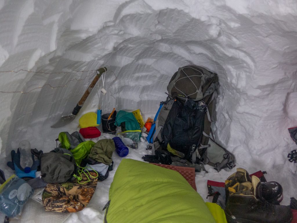With the temperatures forecast to drop to -12c, and my sleeping bag rated nowhere near that, I’d taken a thick down jacket that I’d wear inside the bag, along with some primaloft trousers. There’s a persistent myth about being bare naked in a sleeping bag is somehow “best” but it’s utter bullshit that a quick consideration of the science involved refutes. Like non-sleeping insulation, layering is key, not being too hot and sweating and not being too cold. PHD (world class expedition gear) agree that a layered system is more flexible, and if a insulated jacket is required, can be more efficient. In my case it allows moving around the cave instead of having to retire to the bag and operate from there until sleeping, which can be awkward.