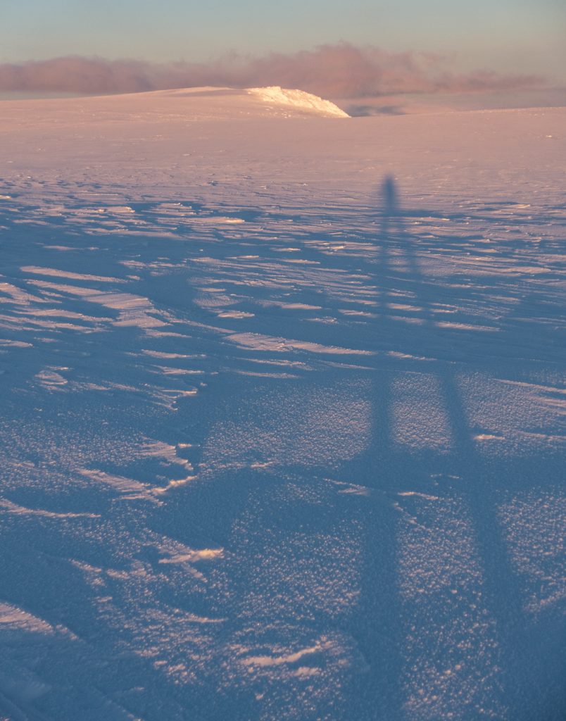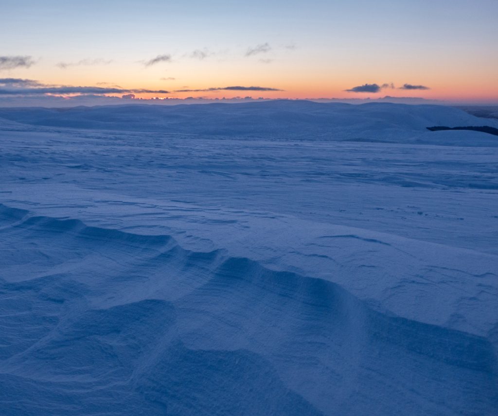 I headed back over Eagles Rock to get a view of sunrise (checked the angle using photographer’s ephemeris app). Interestingly, my foot steps from the previous night had become inverted as the high wind has eroded the surrounding snow but not my compressed prints.