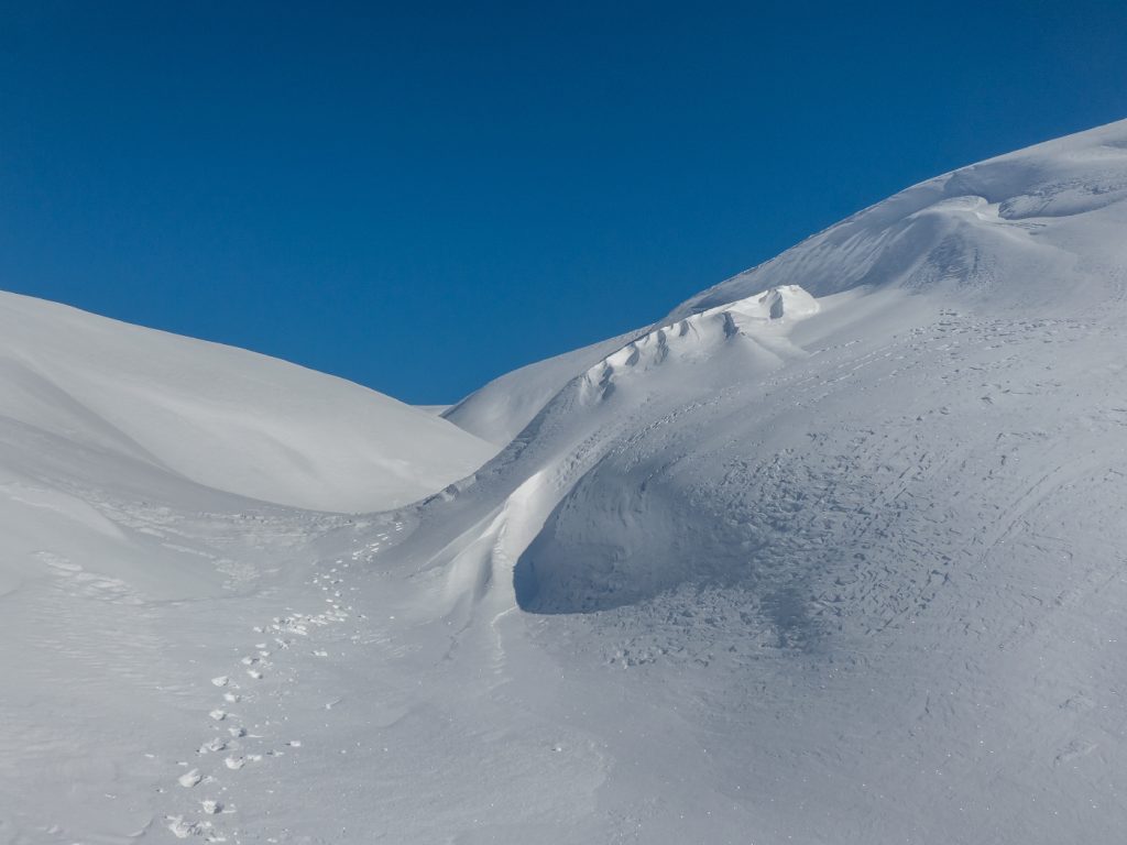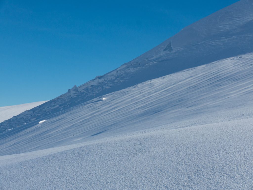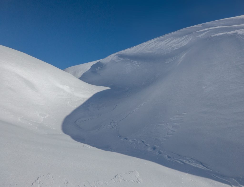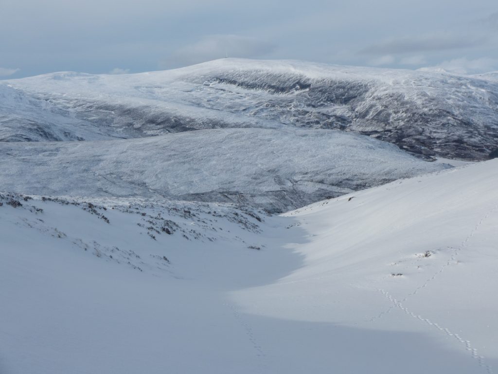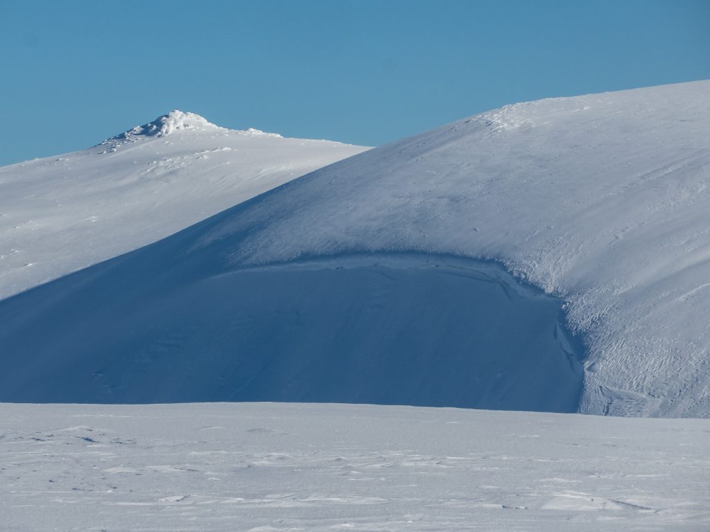The gap between Sagairt Mor and Beag was a potential location to dig a snowhole and had deep snow, but the loaded convex slope unnerved me and with the obvious evidence of avalanche hazard nearby, I didn’t descend to investigate.
