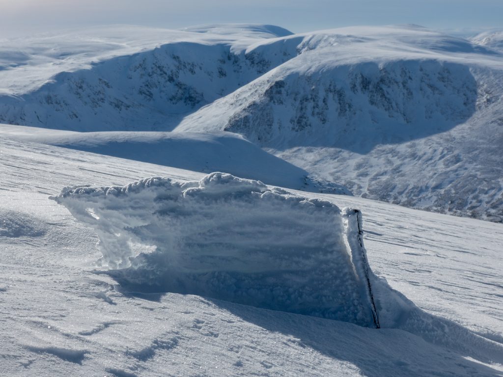 There was every chance the descent to the north would be the same, so I spent a moment ensuring the boot laces were tightened so my feet didn’t toe bang the front, and the crampons were perfectly on. Heading down the usual method of following the posts wasn’t a goer as they were all buried except one or two – and had they caught a nose of rime!