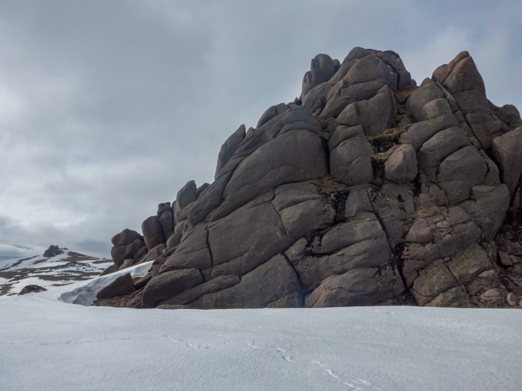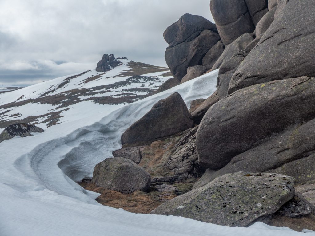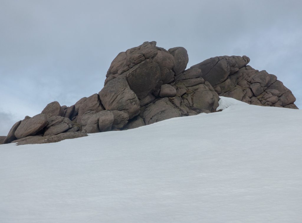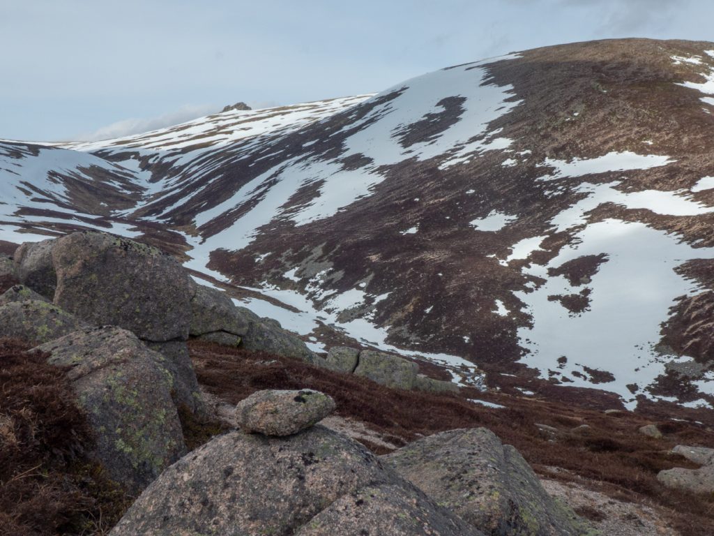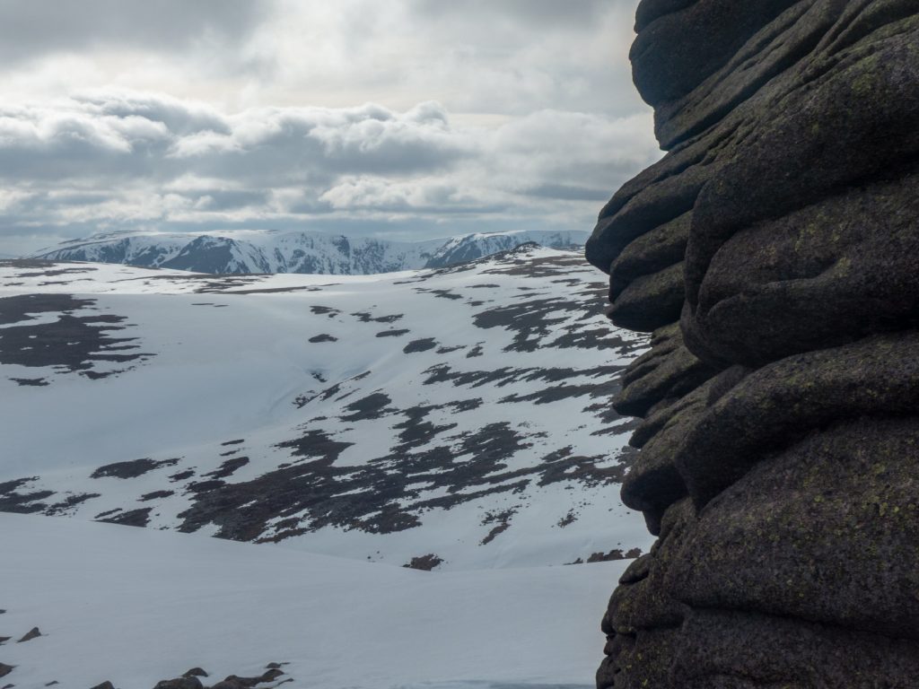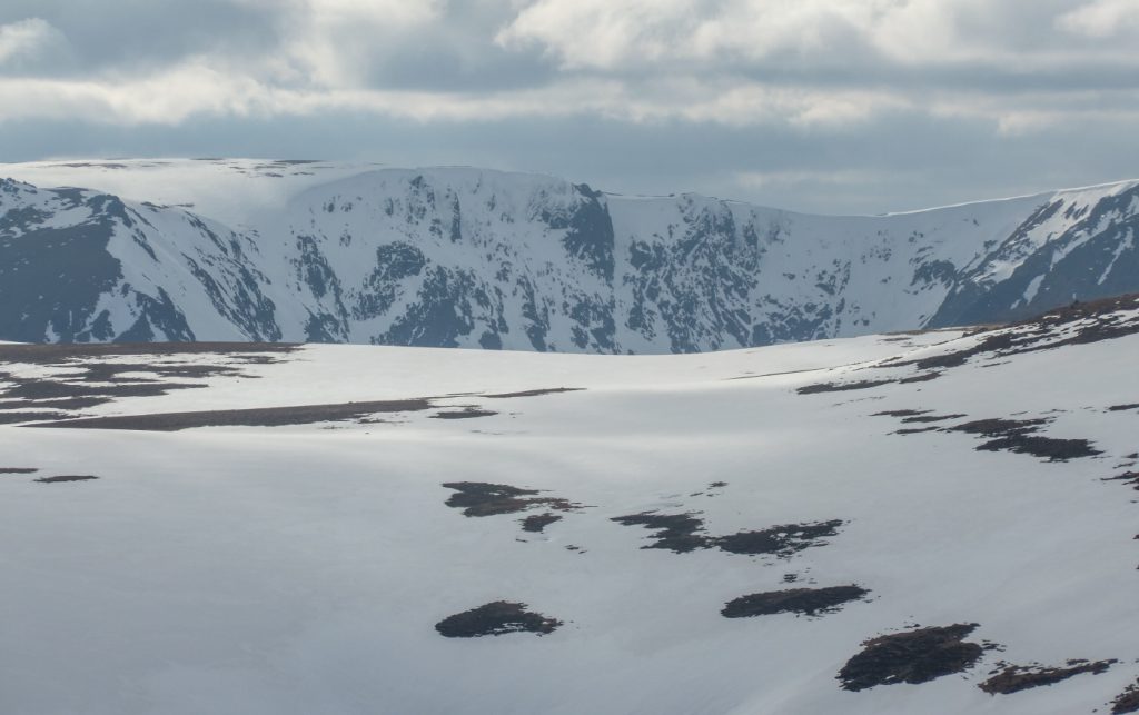 At my first plateau tor, Stob Dubh an Eas Bhig, i could hear ptarmigan around but not see them as they padded through the snow, until almost on top of some which suddenly fluttered. I decided to make my way to the gem-hunters corrie, which was as expected deep in crumbling snow, then on to the left bit of the upper Allt an Eas Mhoir, which also had an impressive snow wall. One year I’ll need to do a snowhole here.