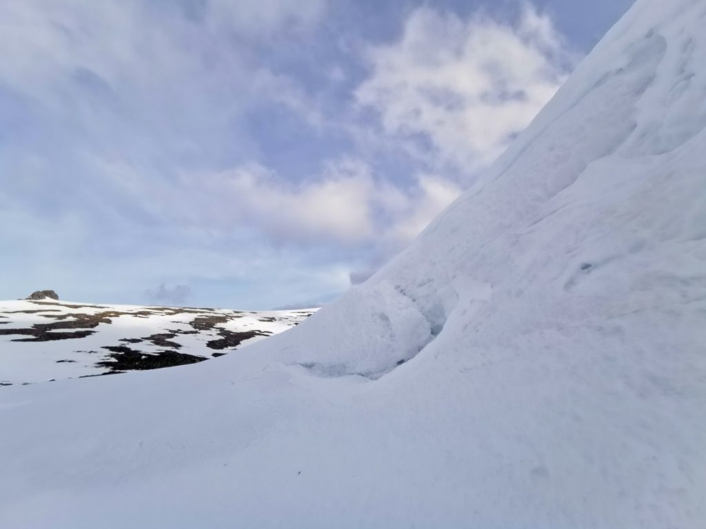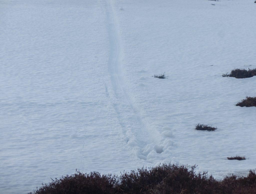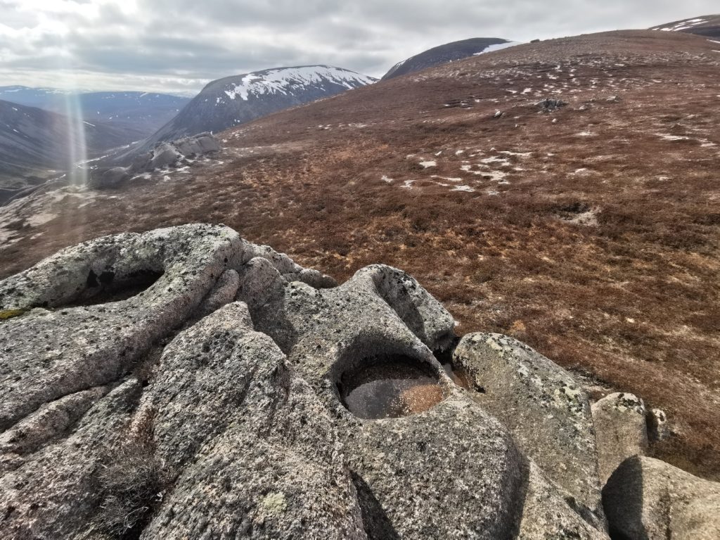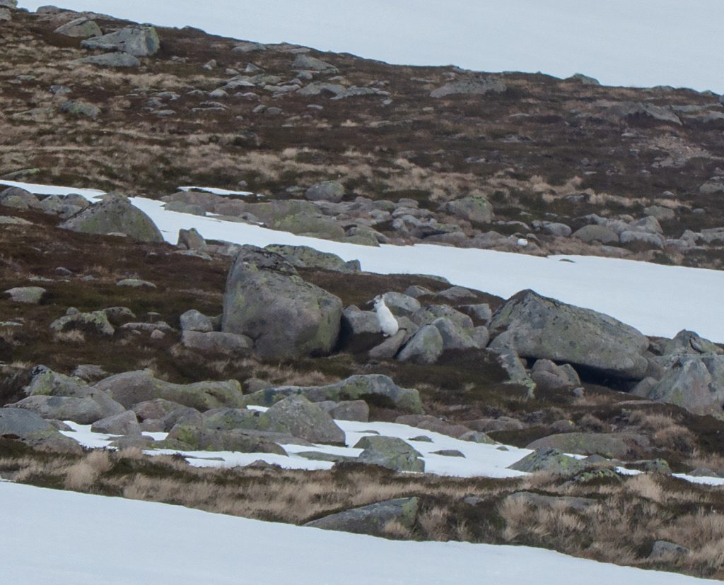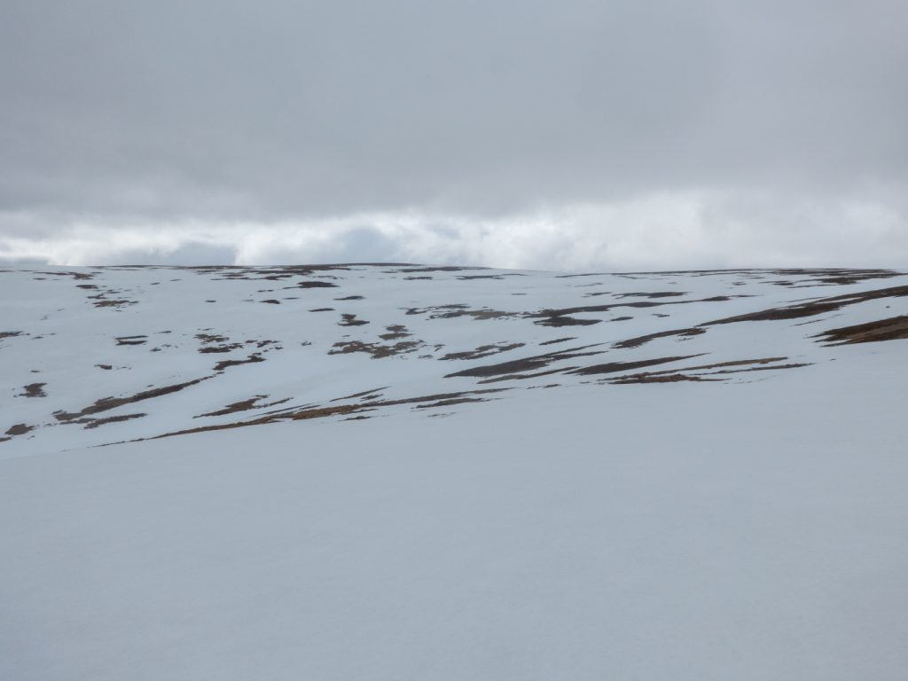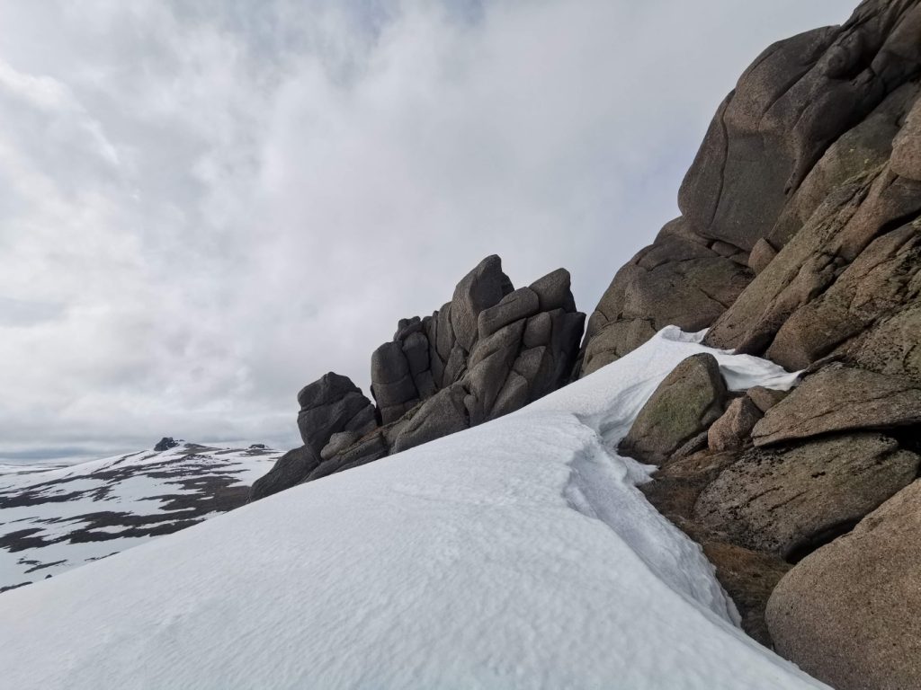 At my first plateau tor, Stob Dubh an Eas Bhig, i could hear ptarmigan around but not see them as they padded through the snow, until almost on top of some which suddenly fluttered. I decided to make my way to the gem-hunters corrie, which was as expected deep in crumbling snow, then on to the left bit of the upper Allt an Eas Mhoir, which also had an impressive snow wall. One year I’ll need to do a snowhole here.