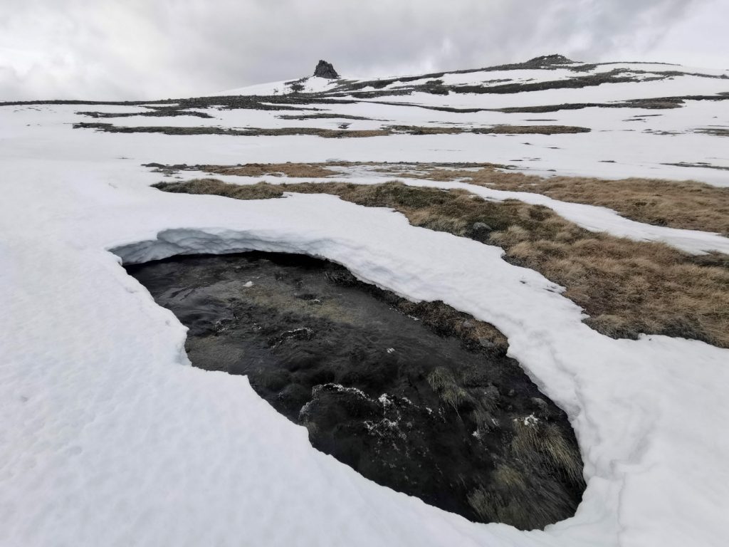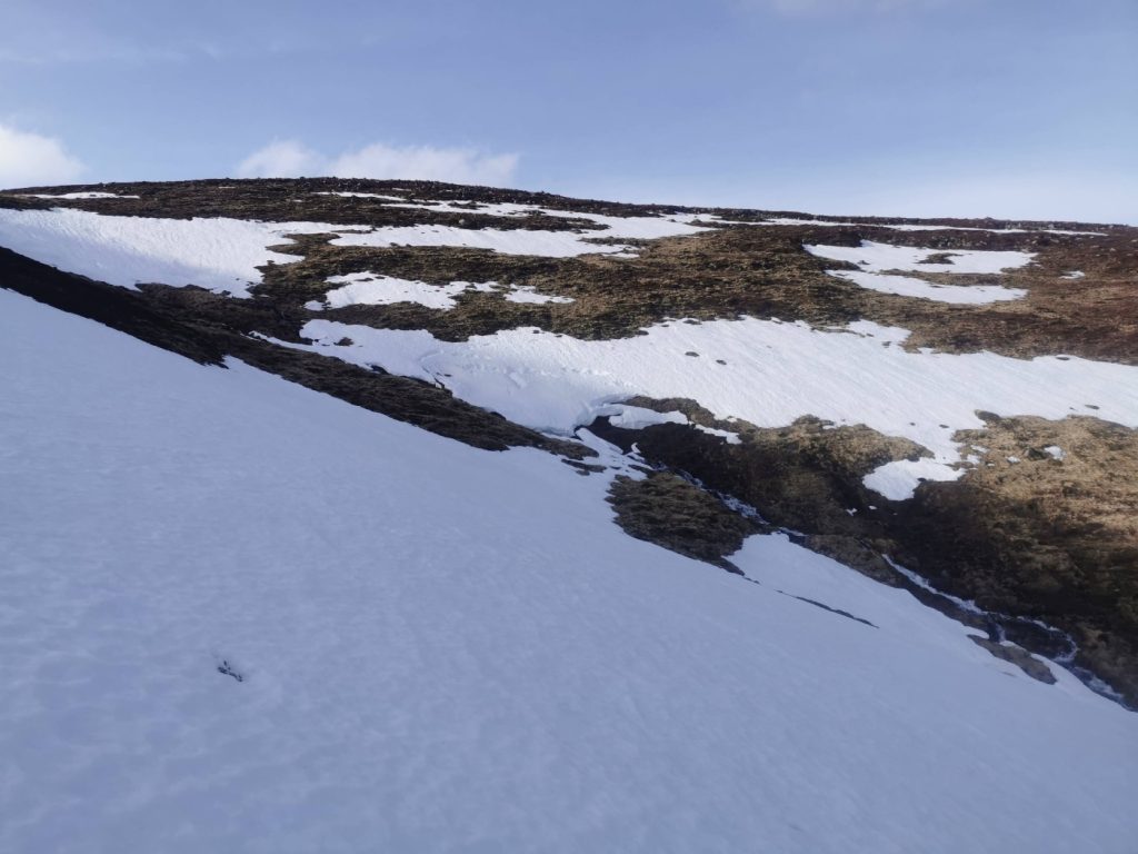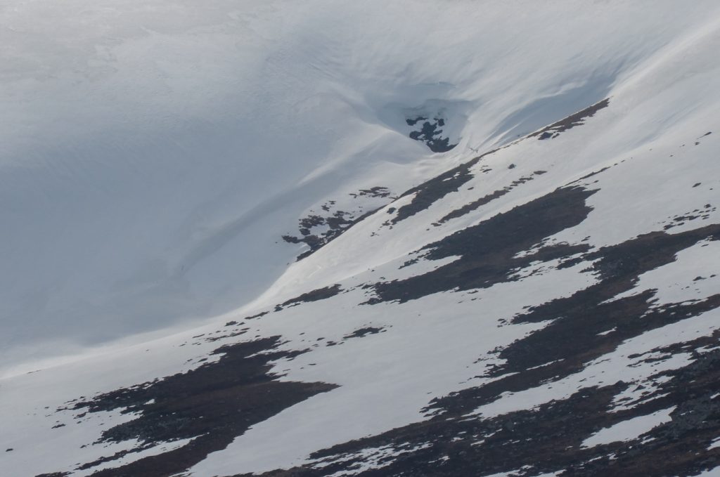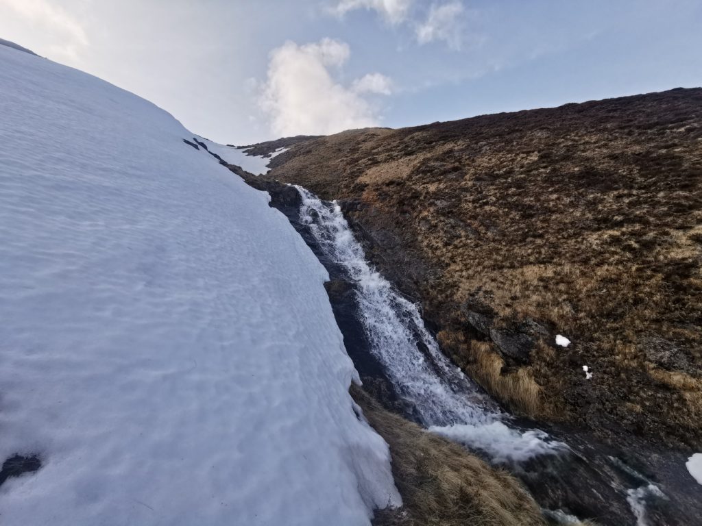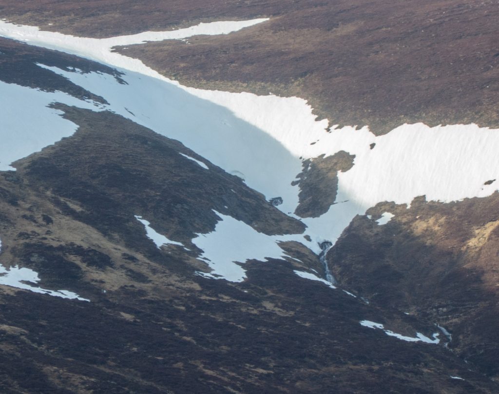 Earlier I’d spotted the two eastern stream gullies, the Allt Phouple and Allt Bad a Mhonaidh and though that despite generally good snow cover they were a bit “thin” nonetheless as the descent slope steepened I managed a few glissades in the soft thawing snow, careful to not teeter over into the depths of the gully where I’d seen a few holes. The reason these gullies have less snow than expected is down to the wind – when there’s been major snowfall, the winds hasn’t been in it’s usual westerly direction. Not much chance this year of snow tunnels on this side.