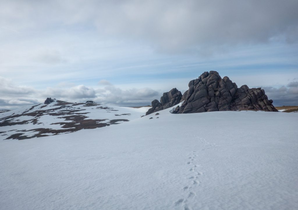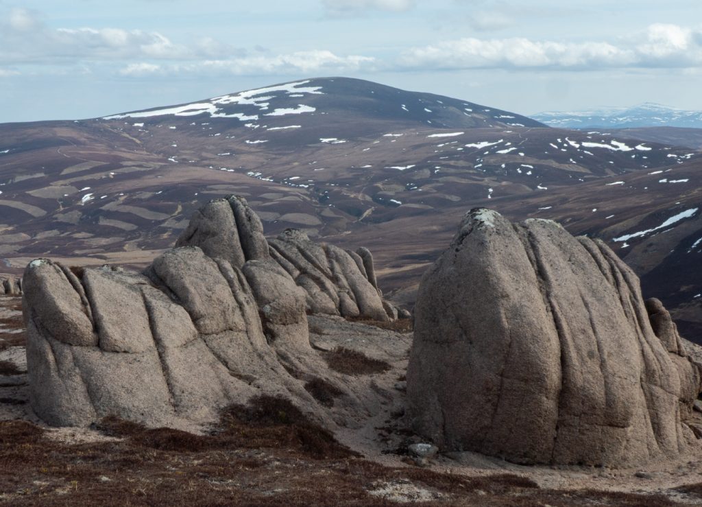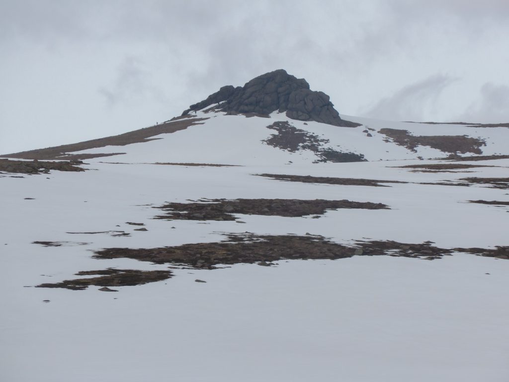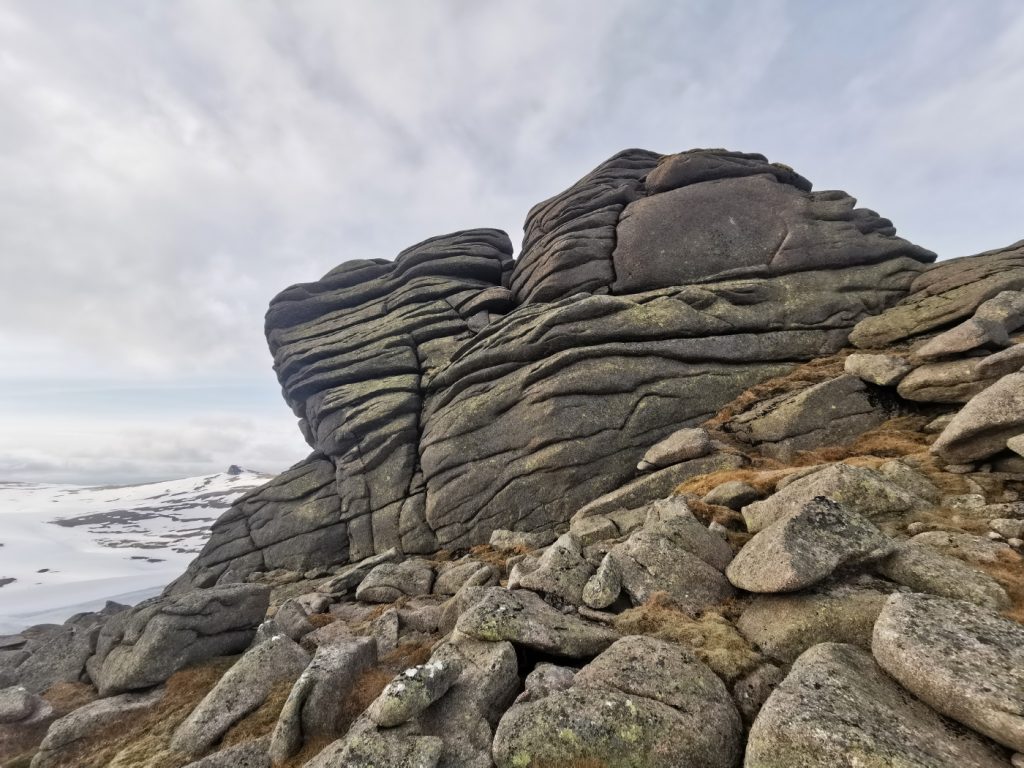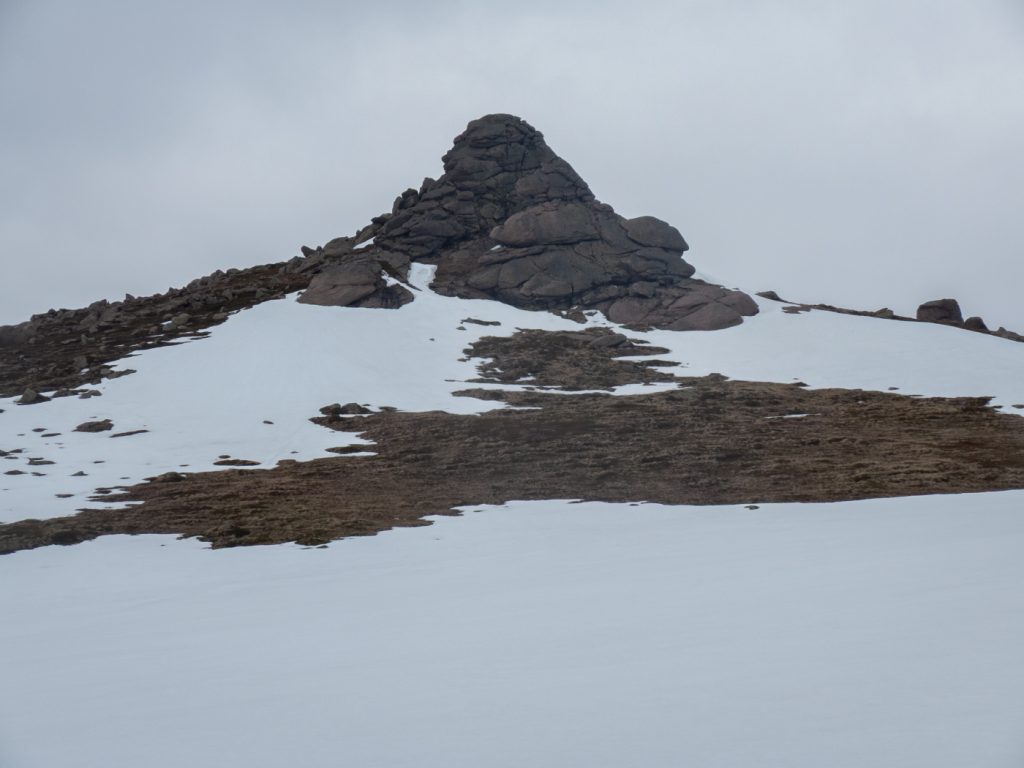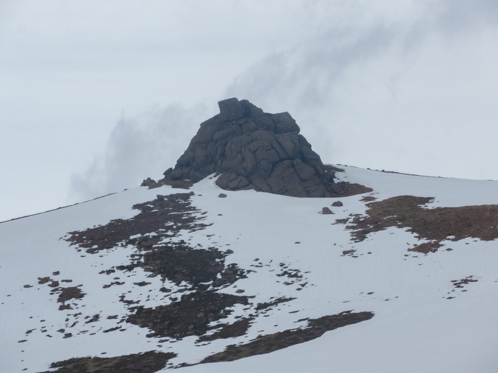 I was a bit behind schedule so skipped the main top and headed to Clach Choutsaich. I stopped for a quick lunch, just managing without gloves to get some munch down before the windchill defeated that, and I dug out the mitts. I’d hoped to head on to the Meur Gorm Craigs further north-east but the extra few miles wasn’t happening in the time available. I headed south the final plateau tor of the day, Stuc Garbh Mhor.