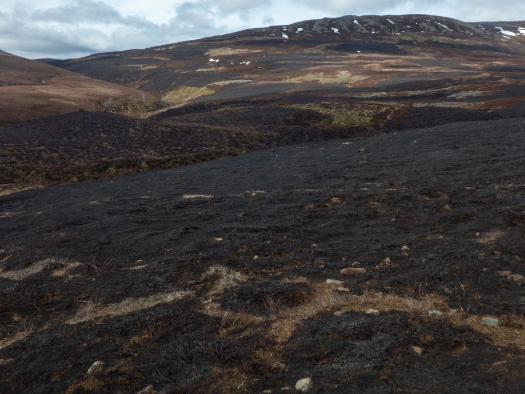 I could smell burning and soon enough was passing through a battlefield of recently scorched land as far as one could see towards Cairn Liath. Invercauld doing their usual archaic violence on the landscape, desperate to bludgeon nature in advance of their April deadline despite a high-risk alert being broadcast to campers, and the imminent national park ban on fire over the summer – one rule for the little people, another for the landed aristocracy.