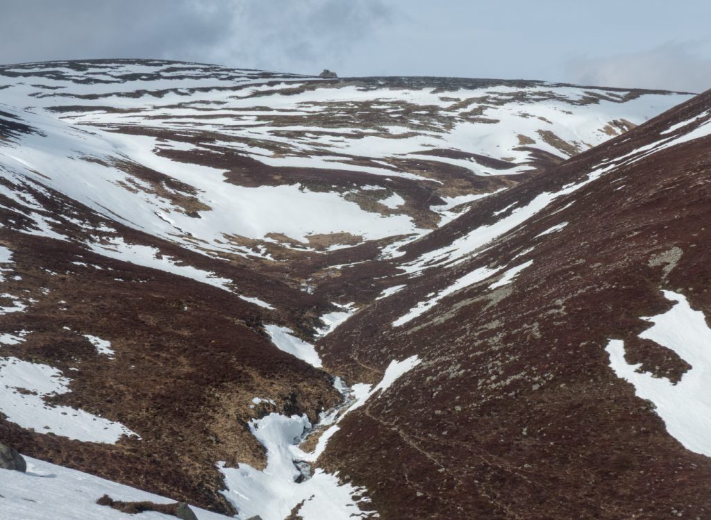 I dumped the bike in a rocky cleft and made down the scritchy path, a few old patches of muirburn muddy and spartan and entirely illustrating the lie that it’s good for nature. I retrospect I should have rid further up the hill and then down to the river Gairn. Soon enough I was at the Allt Eas Mhor – foaming with snow melt, and i had to follow upstream until I could sneak across, thankfully without donning the water shoes.