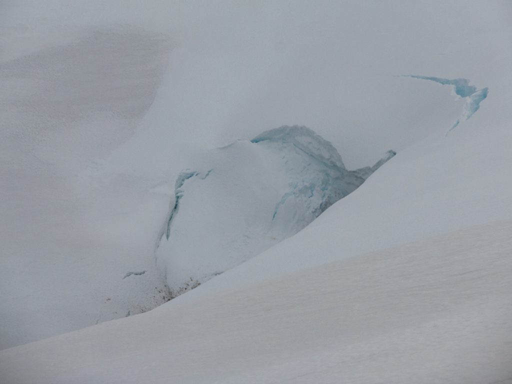 Above the gem-hunters corrie, deep snow is beginning to collapse. Decide to not head down for a closer look