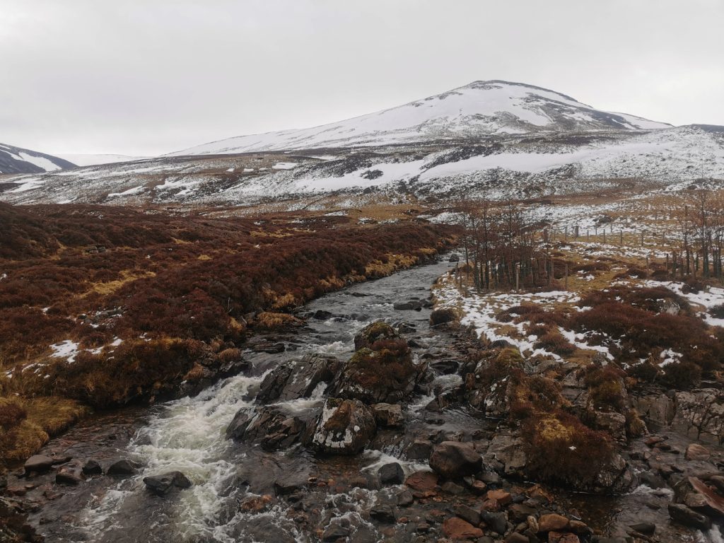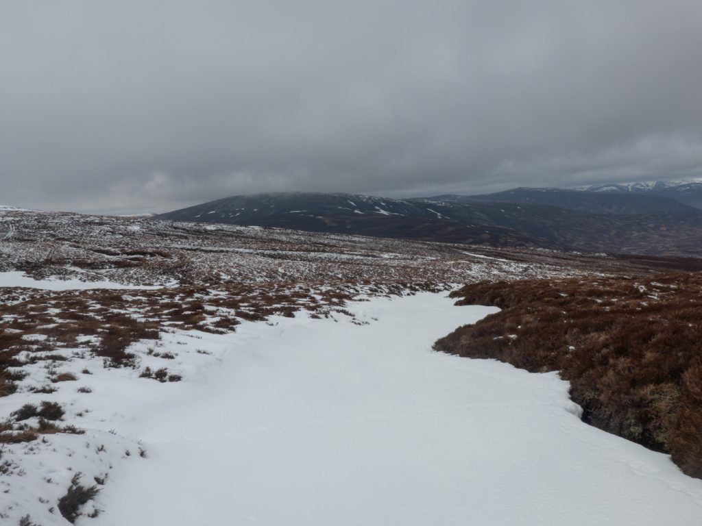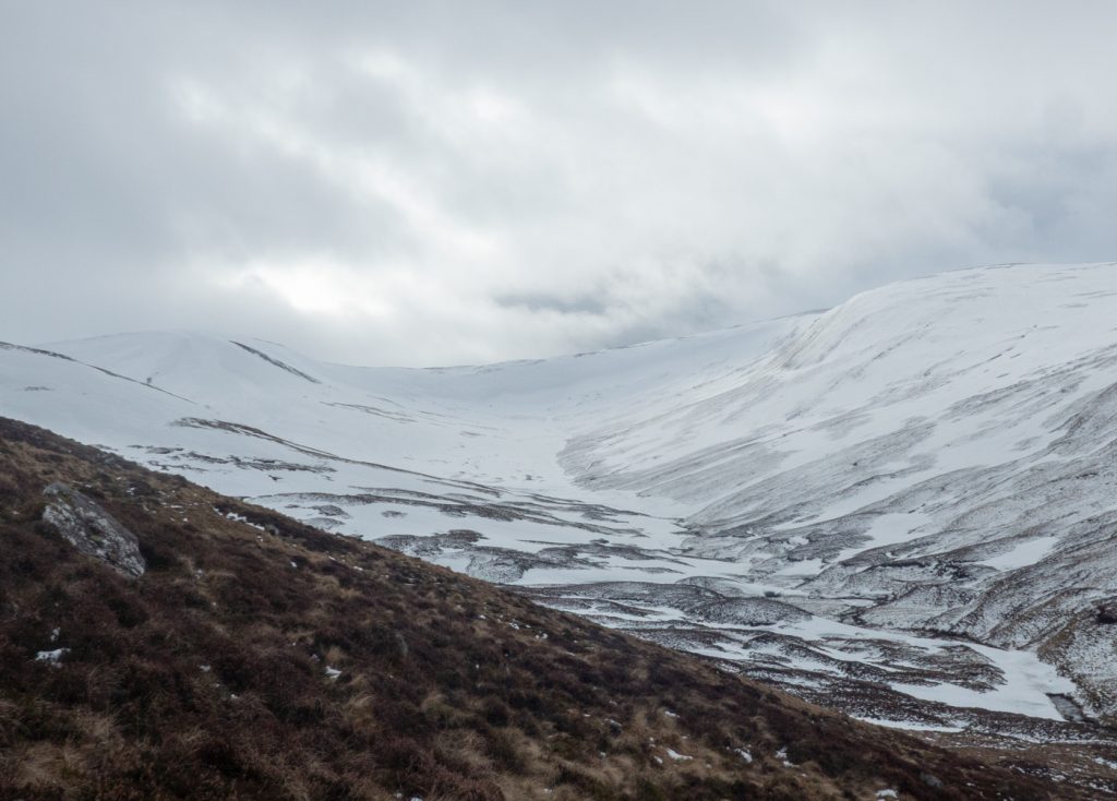 As is often the case, the weather began to brighten as the day was almost over. Looking back along the glen I could almost see Tolmount, and forward Ben Avon was nicely lit. There were no regrets about cutting the route short, Tolmount can wait for another day (perhaps a Jocks Road traverse) or some other day when not fighting visibility or a time to finish. I’ve had a few tough long days and many low-visibility blinded tours this winter, and I’m ready for some spring outings and hopefully some more blue sky while the snow persists.