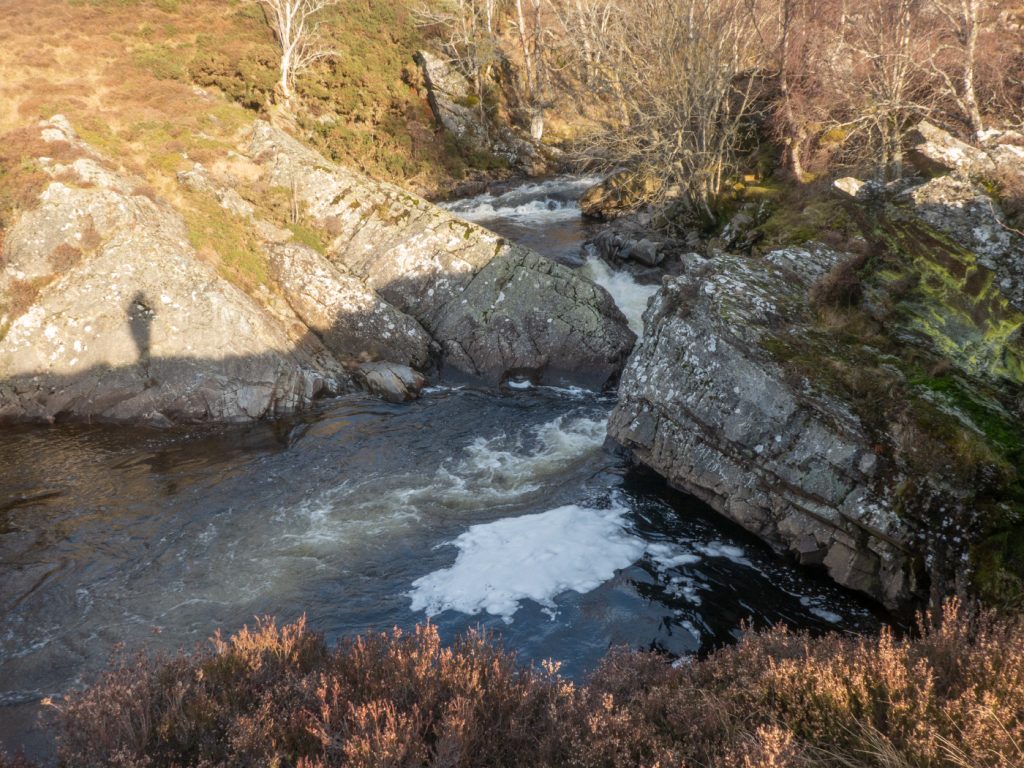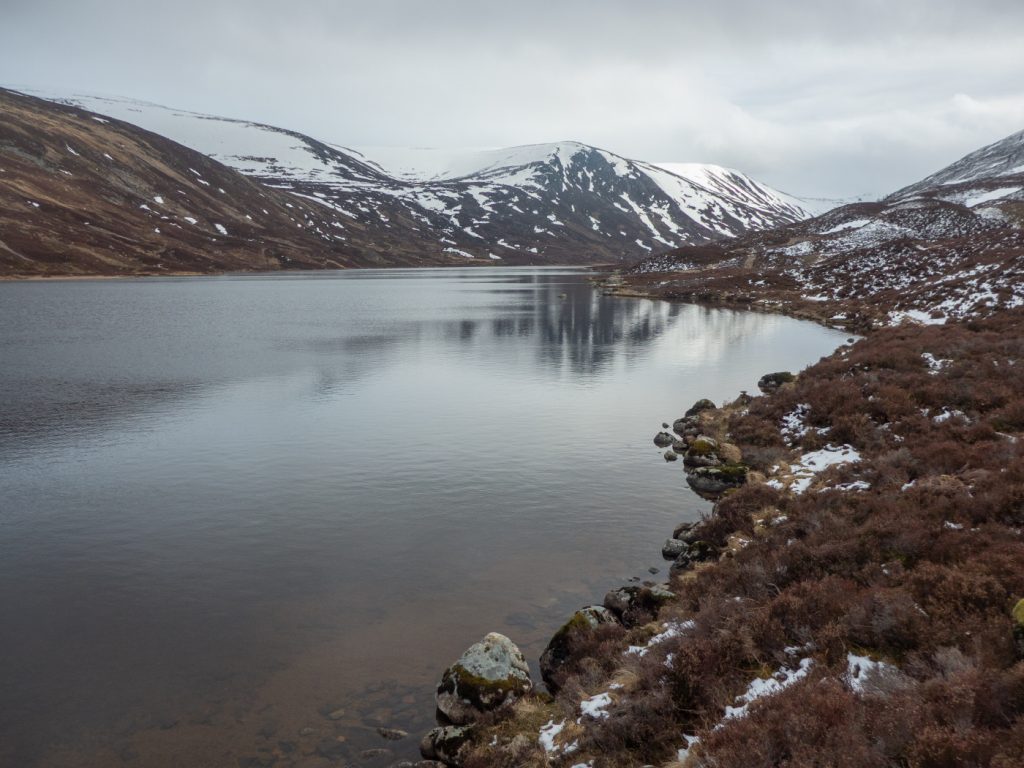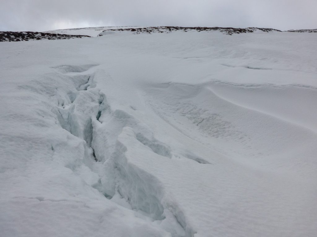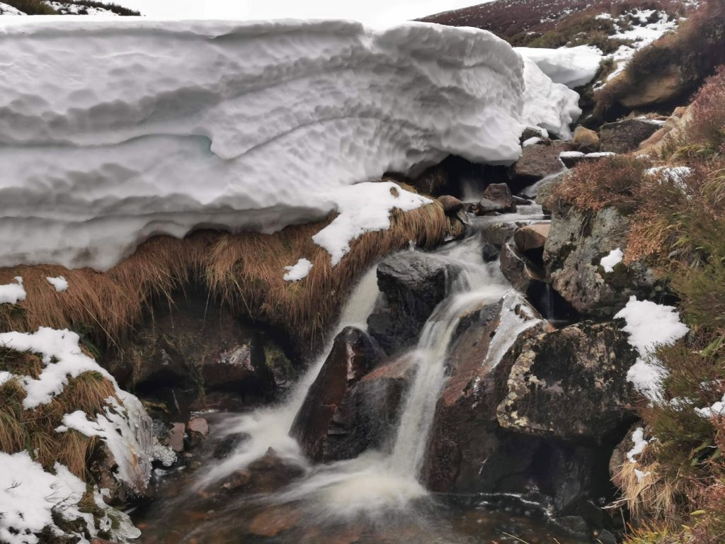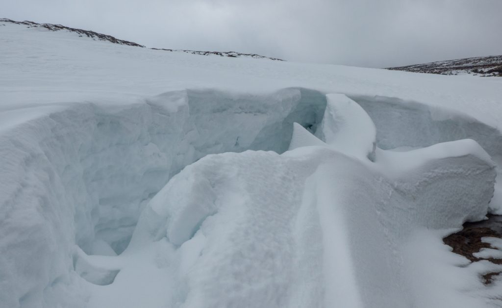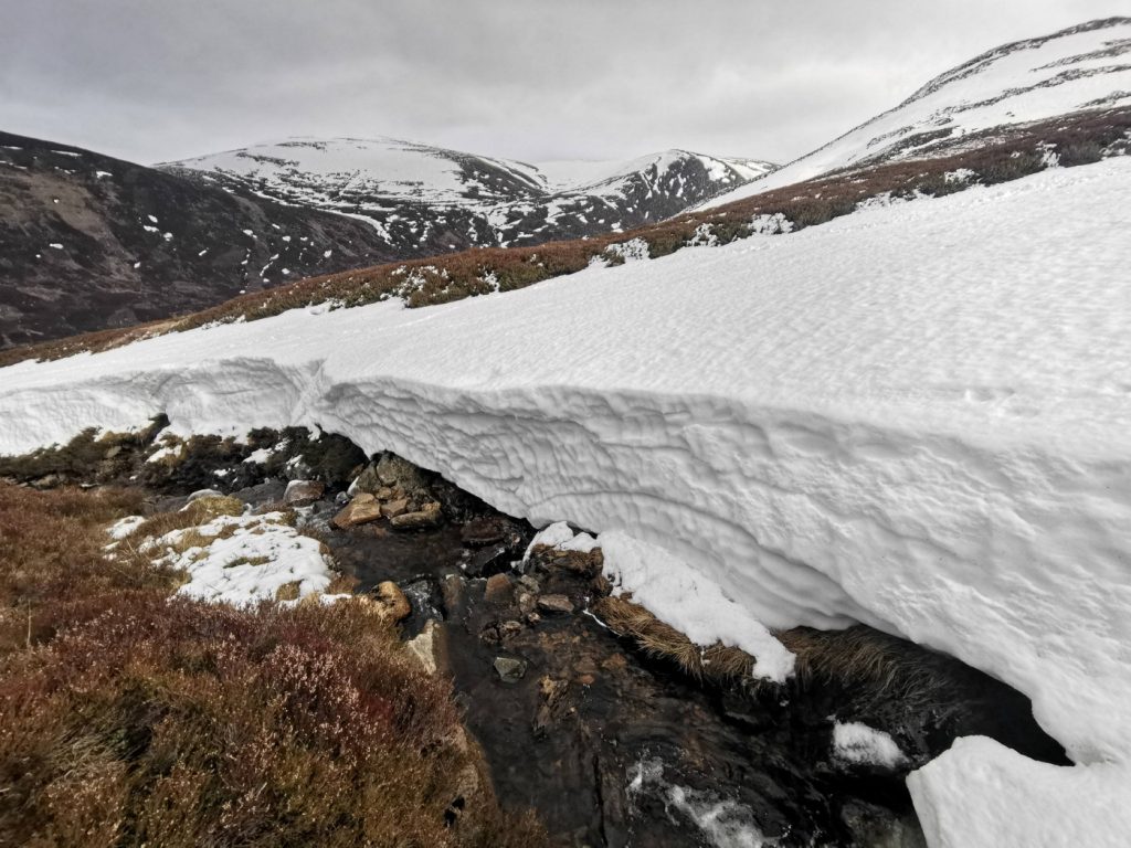We headed for the stream that enters Loch Callater midway along, drawn by some interesting snow sculpture. There was a lot of deep snow that had piled up a few weeks ago, and was now showing almost glacial style cracks and creep-faults. There were some huge snow banks teetering above the stream even lower down.