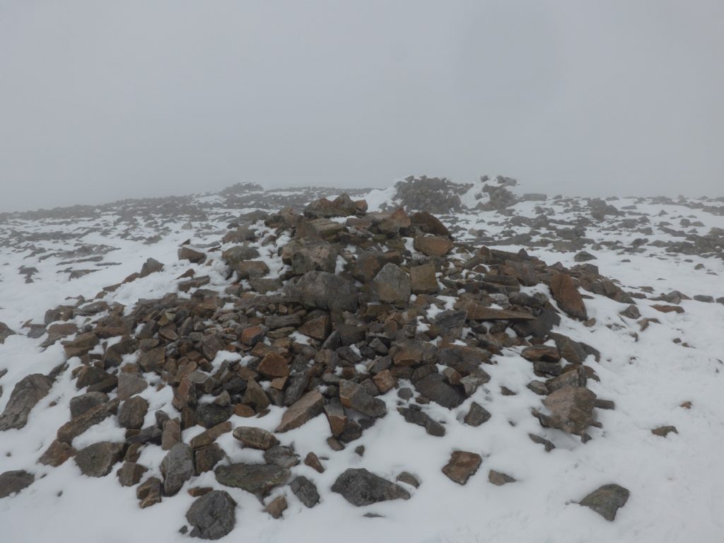 Half an hour of peching saw us break the slope and on to snow at a gentler gradient, then ticked off our first munro of the day. The wind was bracing on the plateau and we were into cloud, so the maps and compasses came out and we headed east and then south to make our way around Cul Riabhach.