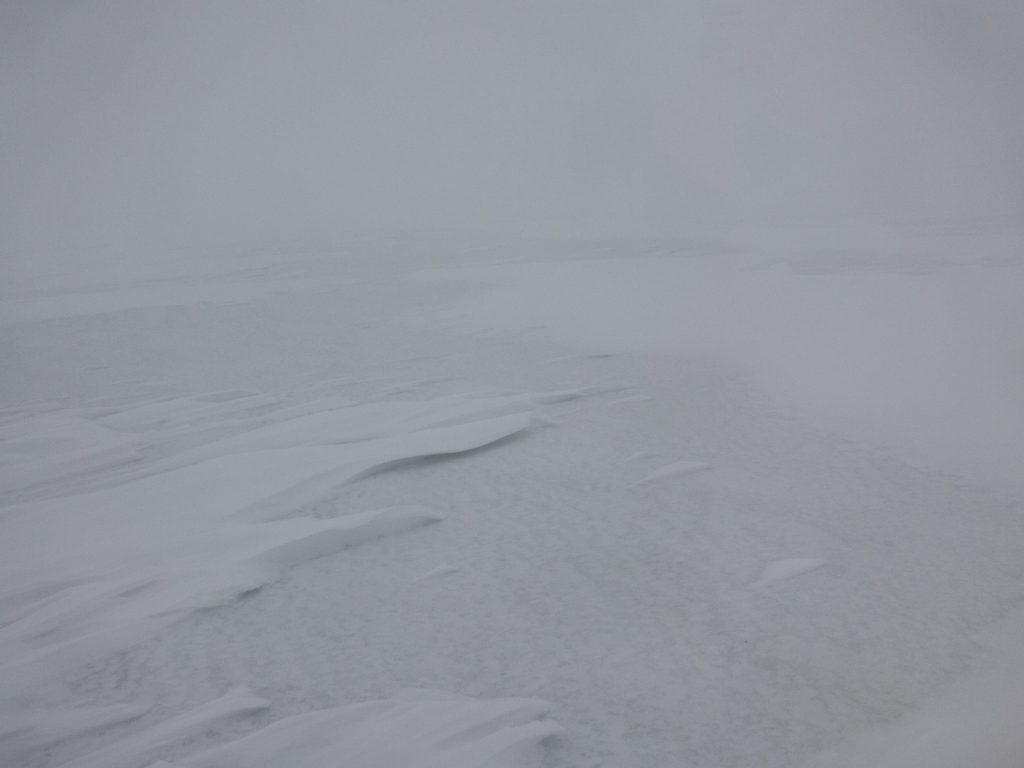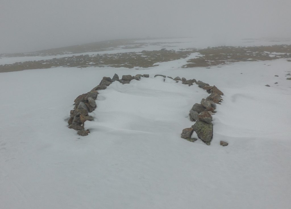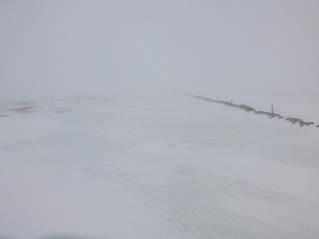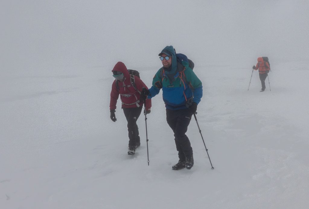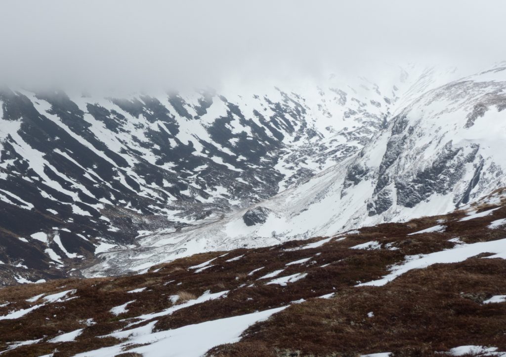 I dug a seat in the summit snow drift and with a cold arse (forgot my sit mat!) took stock of our options. We had slogged in low visibility for a few hours and it didn’t seem likely this would approve. We were slightly behind schedule to meet the expected time at the end. The next leg would be tricky across peat-haggy ground that would likely hold more snow in places, and then the potential was there to have to continue to Fafernie and beyond to have a safe descent back to the glen. As a small group, it was easy to have a discussion around expectations and choices – and we all agreed that taking a shorter route where we descended out of cloud sooner was a good option – we were going to abandon Tolmount, and would head back north to above Coire Loch Kander and then down to the glen.