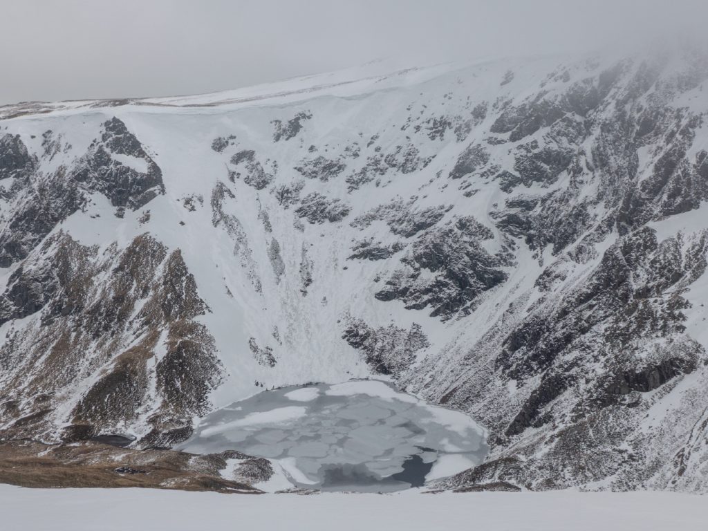 Above Loch Kander we finally got a view of something – we were just about at the edge of the cloud level. The loch was frozen below in the coire, and we could see to the other side of the glen albeit not quite to the end and the descent we’d shunned.
