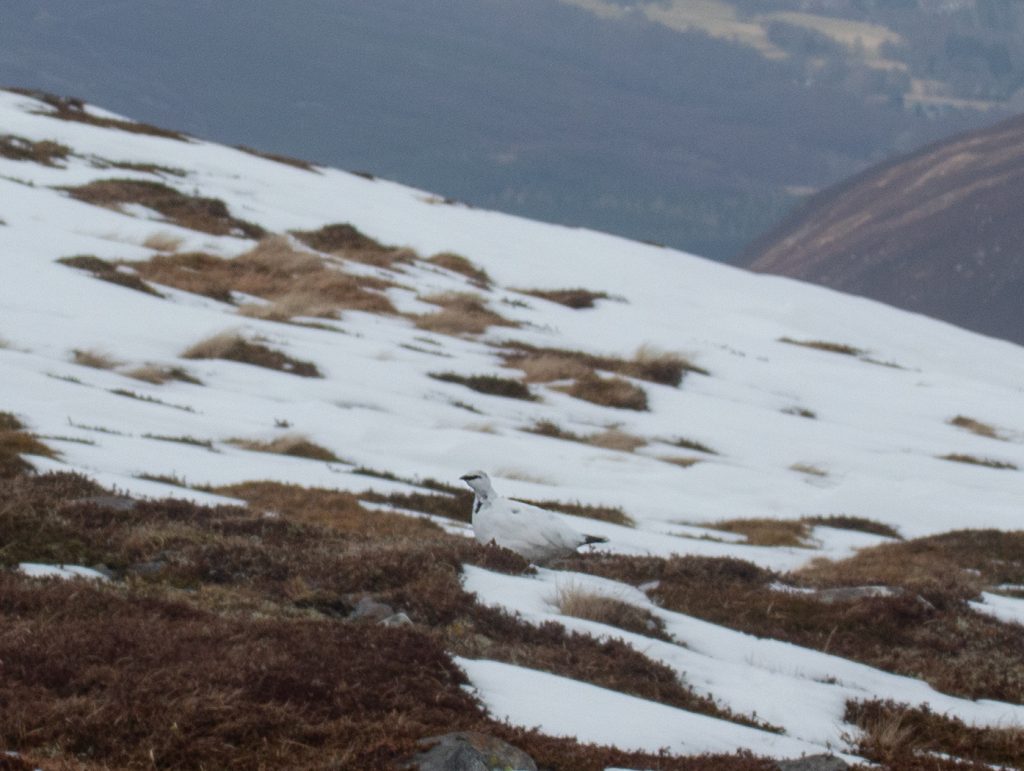 One bonus of the lack of snow on our way up was very easy spotting of fully-white hares that were plentiful with this side being sheltered from the wind.