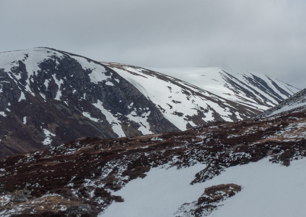 There was an odd patchwork of snow underfoot – older neve not too hard, with streaks and waves of newer snow. It was fairly easy going and we didn’t hit any deep snow here where windswept. We did need to keep an eye on our bearings as no path was visible, just some scattered footprints and ski tracks. The long slope to Cairn of Claise and hesitancy of “are we there yet” was decided as the summit wall came into view.
