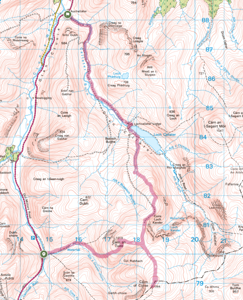 I decided that something else was required that would have more options to cut short or change direction, and avoid any hazardous terrain. When one is a group leader it should sharpen the outlook: is this a sensible route, can it be executed safely and be enjoyable for everybody involved? A long-distance single-direction route that was likely to fail close to the target was not something I was happy to endorse. Looking at the map, a traverse made much more sense – starting at Glenshee reduced ascent by 200m, distance by a few KM, and opened up multiple options earlier in proceedings. On the coach out from Aberdeen, I showed a printed map with the options overlaid and detailed (a lot easier to explain visually rather than verbally using placenames that some might not be familiar with). The others wanting to do the “high” route agreed, and myself and the 3 others were dropped off down from the ski centre before it headed downhill to drop off the others doing other less challenging routes.